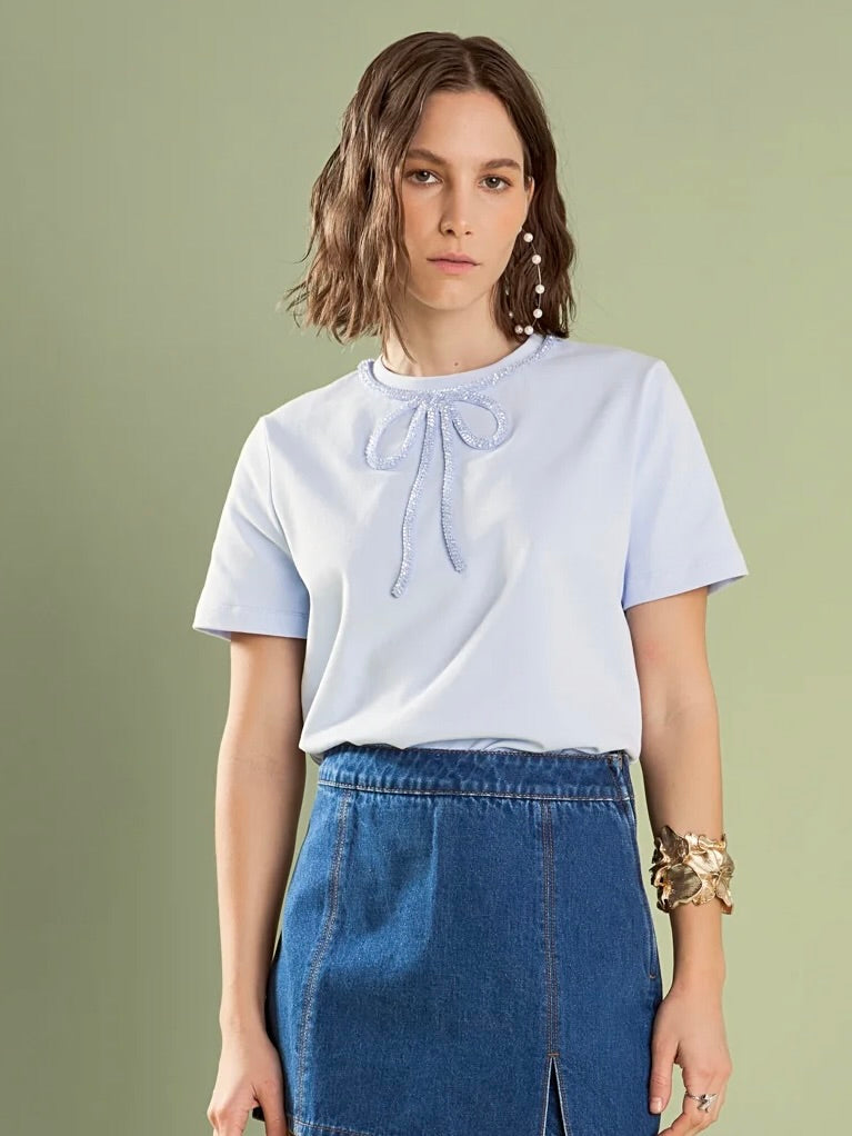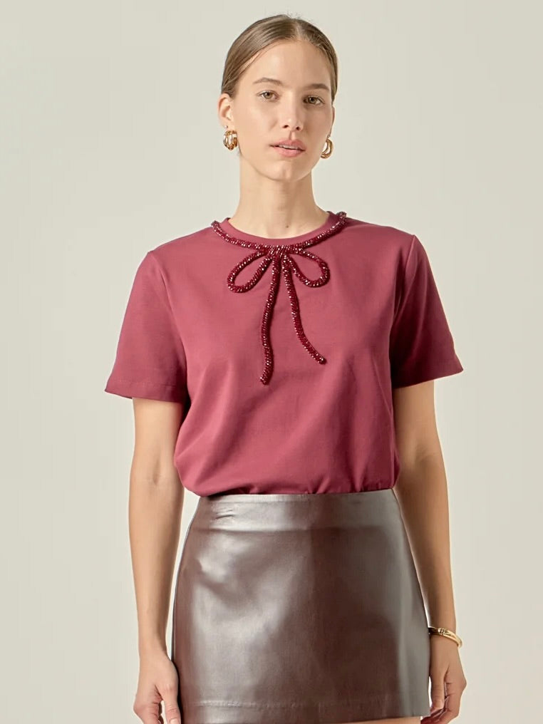 Meet the Beaded Bow Tee, a wardrobe essential that combines effortless comfort with refined elegance. Made from ultra-soft, premium fabric, this timeless t-shirt is elevated by a beautifully beaded bow embellishment at the neckline, adding a touch of sophistication to any look. Designed with versatility in mind, it transitions seamlessly from casual to dressy occasions, making it perfect for workdays, parties, or everyday wear. Featuring a classic crew neckline, short sleeves, and a delicate back keyhole with button closure, this tee is as practical as it is stylish.