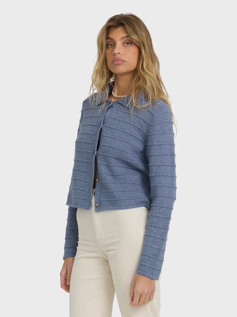 The Ayla Sky Sweater blends laid-back comfort with a touch of attitude. Its relaxed fit and button-up collar make it effortlessly casual, while the subtle metal plate detail gives your everyday outfit a modern, unexpected twist.