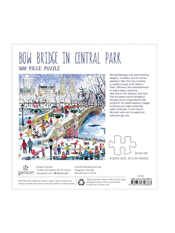 Get lost in the enchanting winter scene of Central Park with the Bow Bridge jigsaw puzzle from Galison. Designed by renowned artist Michael Storrings, this 500-piece puzzle captures the beauty and tranquility of New York City during the winter season. Measuring 20" x 20", it offers a challenging yet rewarding experience for puzzle enthusiasts of all ages, making it a perfect activity for family gatherings or quiet evenings at home. Immerse yourself in the vibrant colors and intricate details as you piece together this captivating landscape. With Galison's Bow Bridge puzzle, the magic of Central Park is just a puzzle piece away.