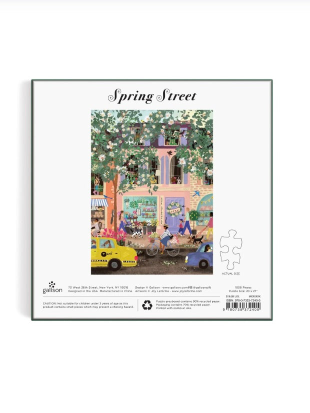 The Spring Street 1000 Piece Puzzle showcases a lively springtime street scene adorned with blooming trees, illustrating everyday life through the artistic vision of Joy Laforme. This engaging puzzle offers a delightful challenge for enthusiasts.