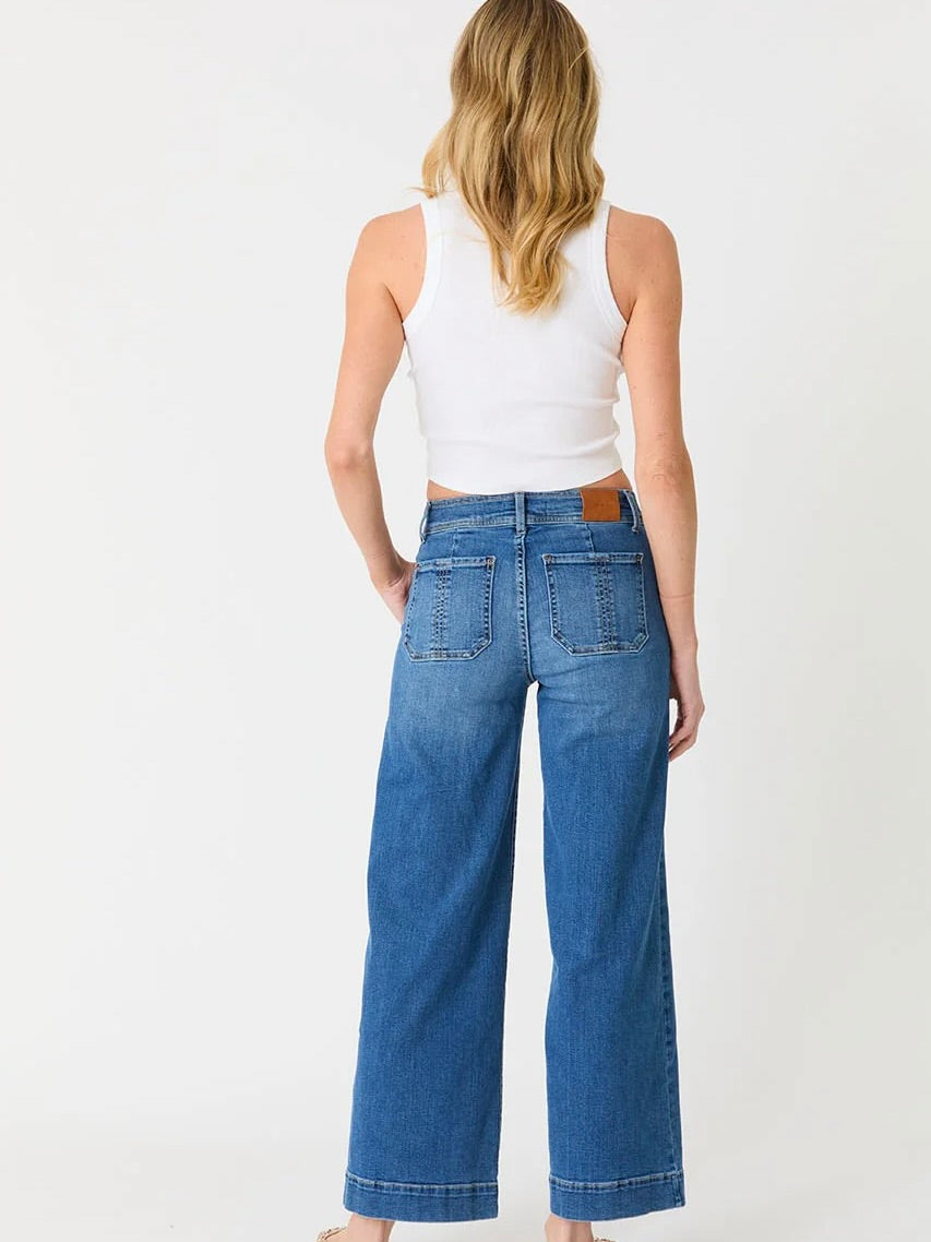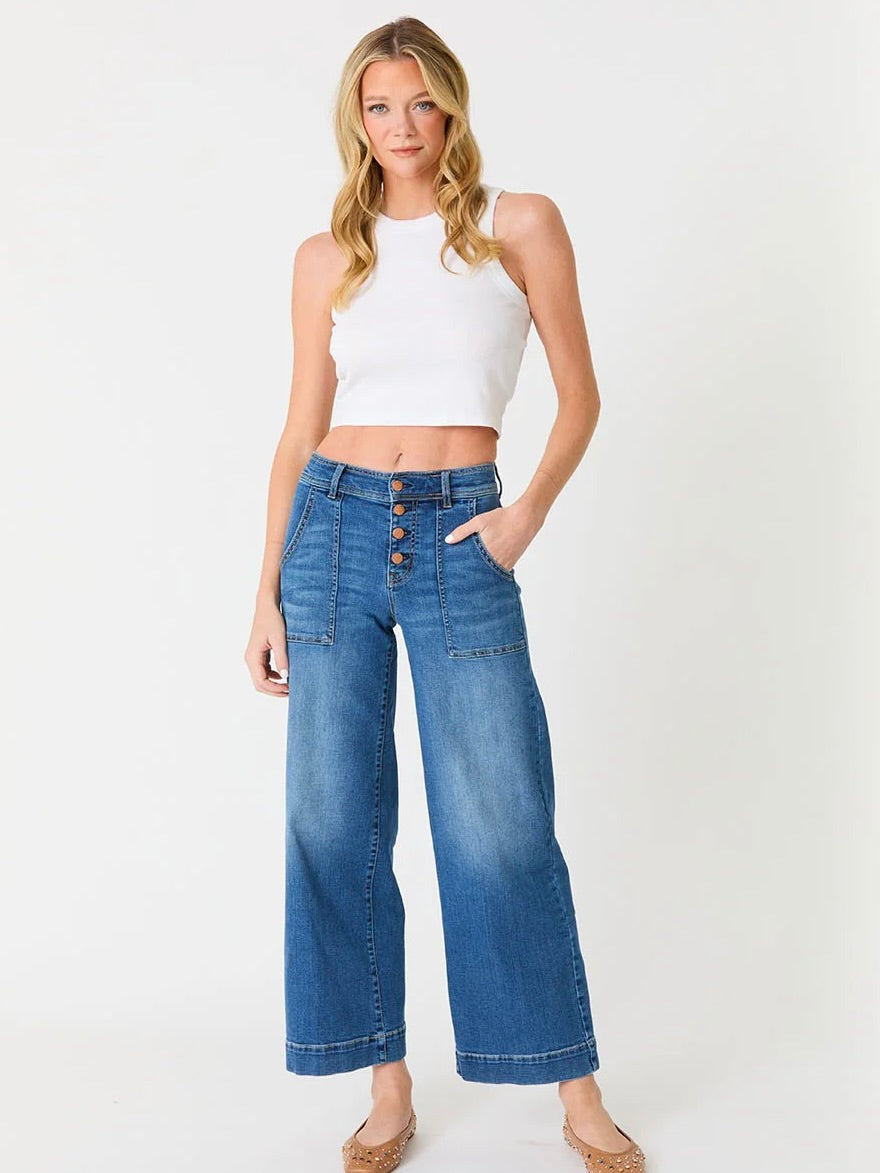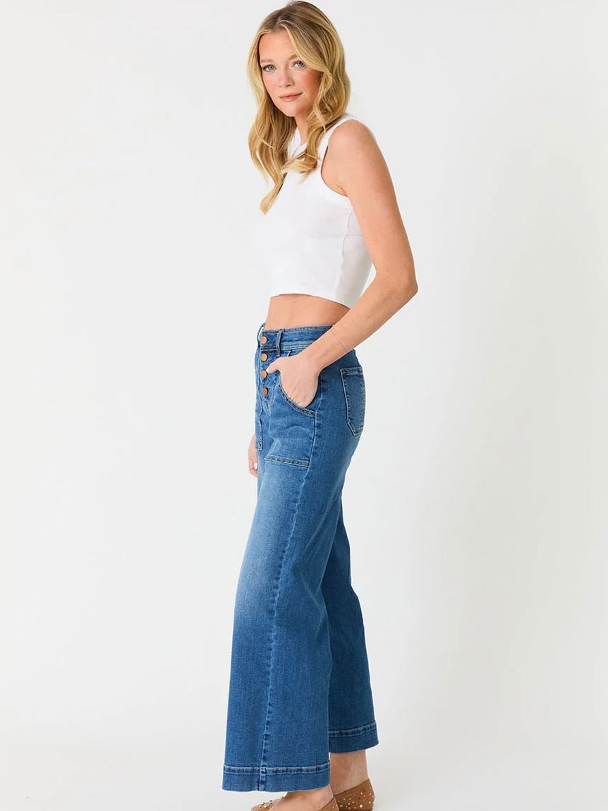 Discover effortless style with the Camille Exposed Button Wide Leg. Designed with a flattering mid-rise, this pant features an exposed button fly and pork chop pockets for a modern utilitarian edge. The ankle-length wide leg silhouette delivers timeless sophistication with a contemporary twist—perfect for pairing with everything from fitted knits to relaxed blouses.