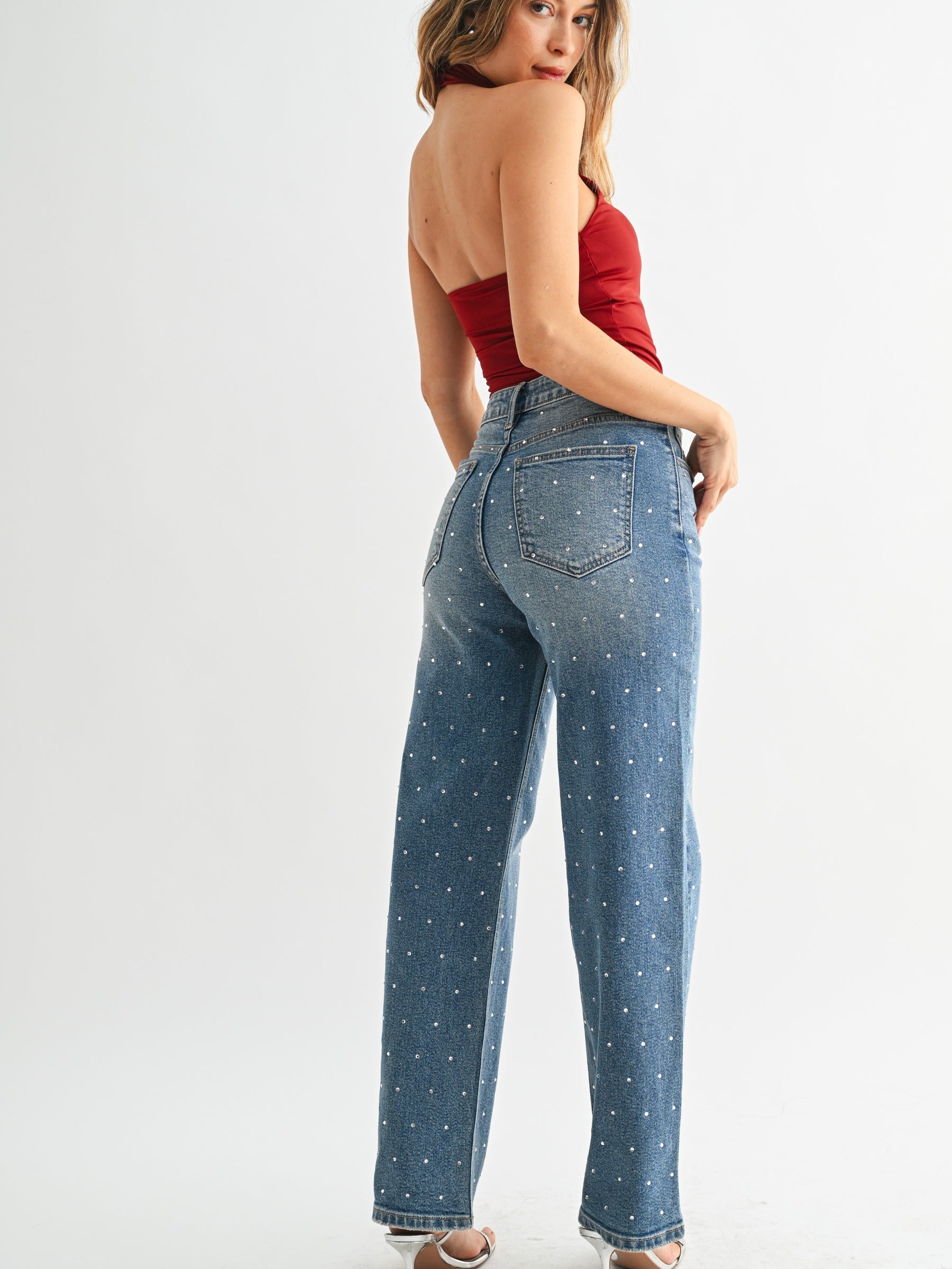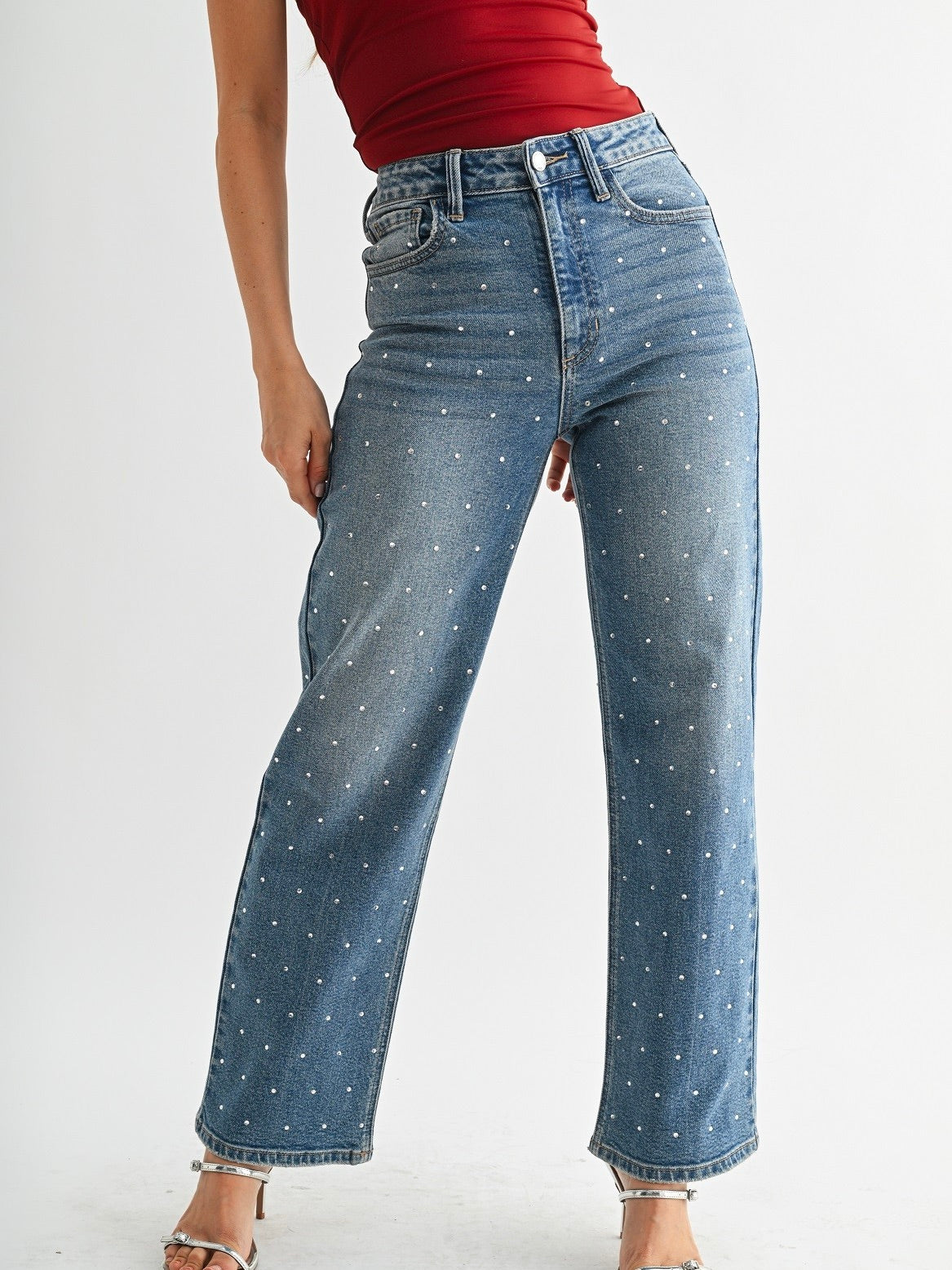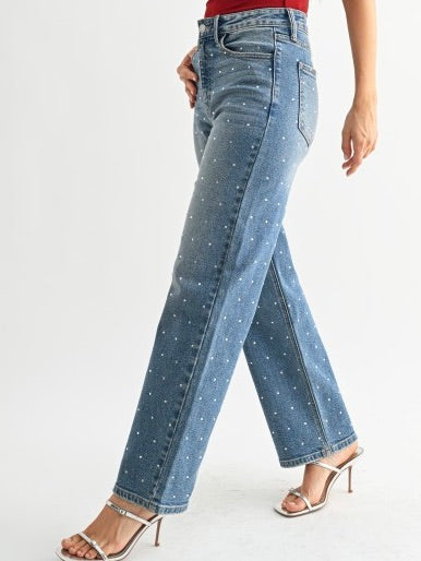 Meet your new statement denim. The High Rise Vintage Straight with Rhinestones blends classic cool with a touch of sparkle. Designed with an 11" rise and a true vintage straight leg, it flatters with just the right amount of structure and stretch. Rhinestone detailing adds a subtle shimmer that catches the light—and a few compliments. Perfect for dressing up, dialing up, or dazzling up any outfit.
