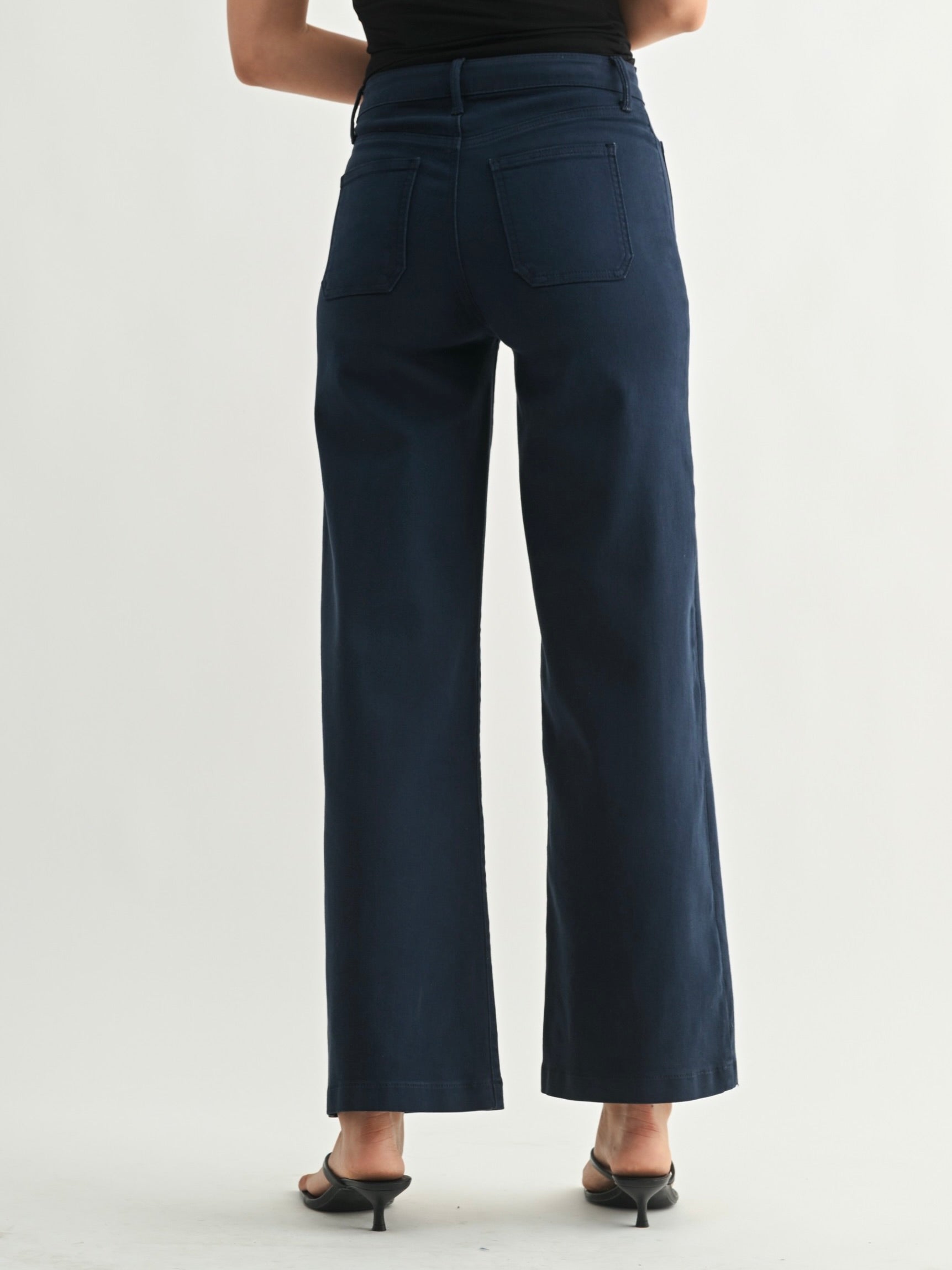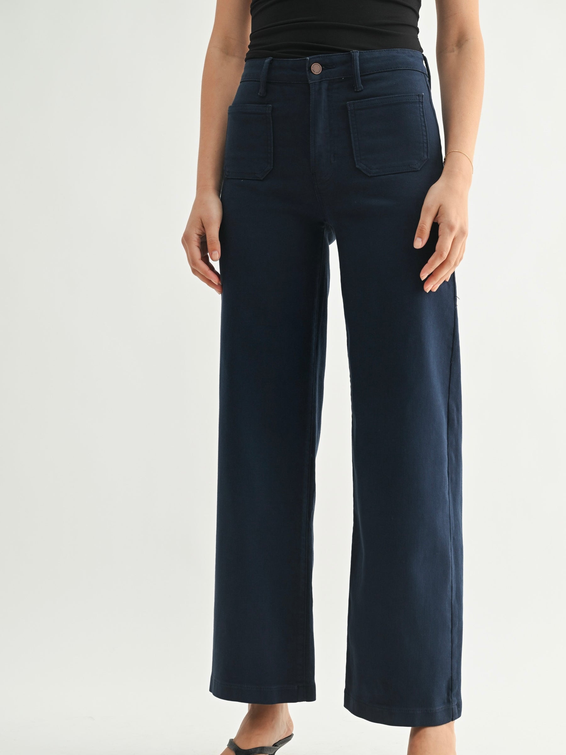Crafted with a flattering high-rise fit, these navy-colored jeans feature a relaxed wide-leg silhouette for an effortlessly chic look. The mini patch pockets add a unique, playful touch, blending functionality with fashion-forward design.