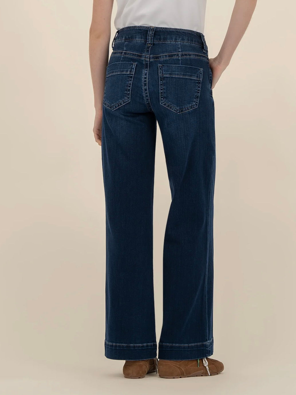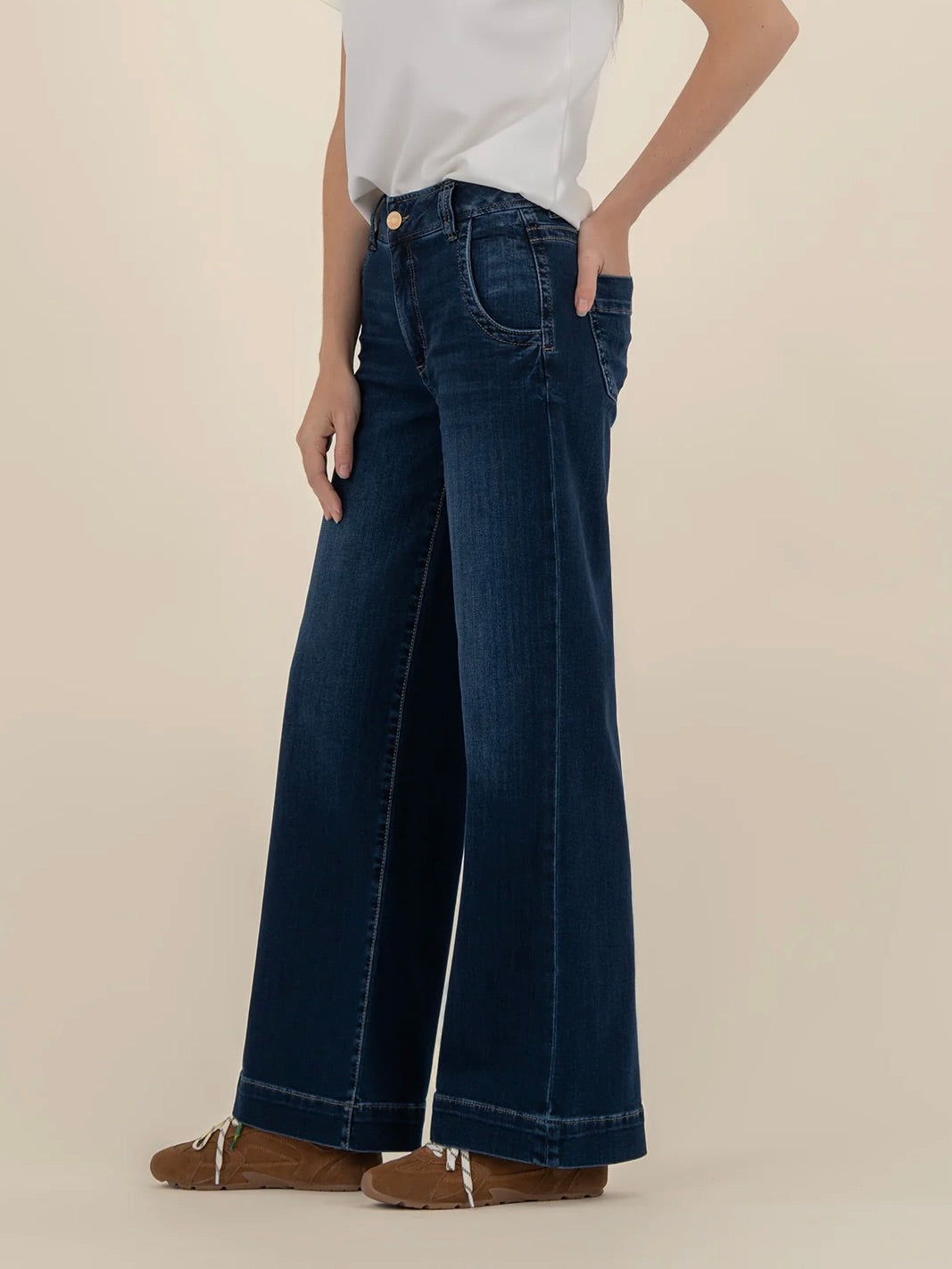 Make a statement in these high-rise wide leg jeans, featuring oversized wide stitching for a bold, elevated look. Crafted from stretchy material in a rich Euro base wash, they offer both standout style and all-day comfort.