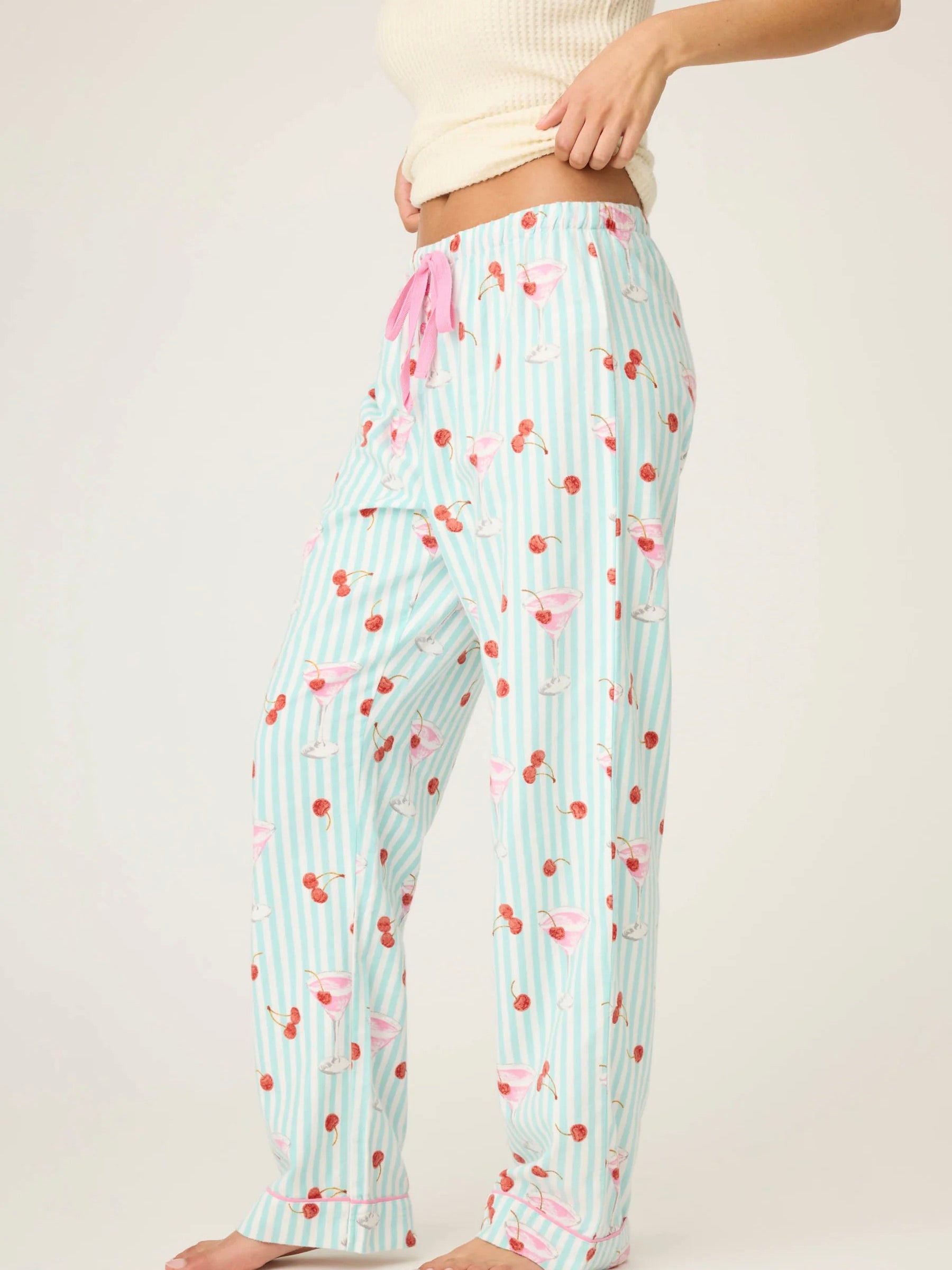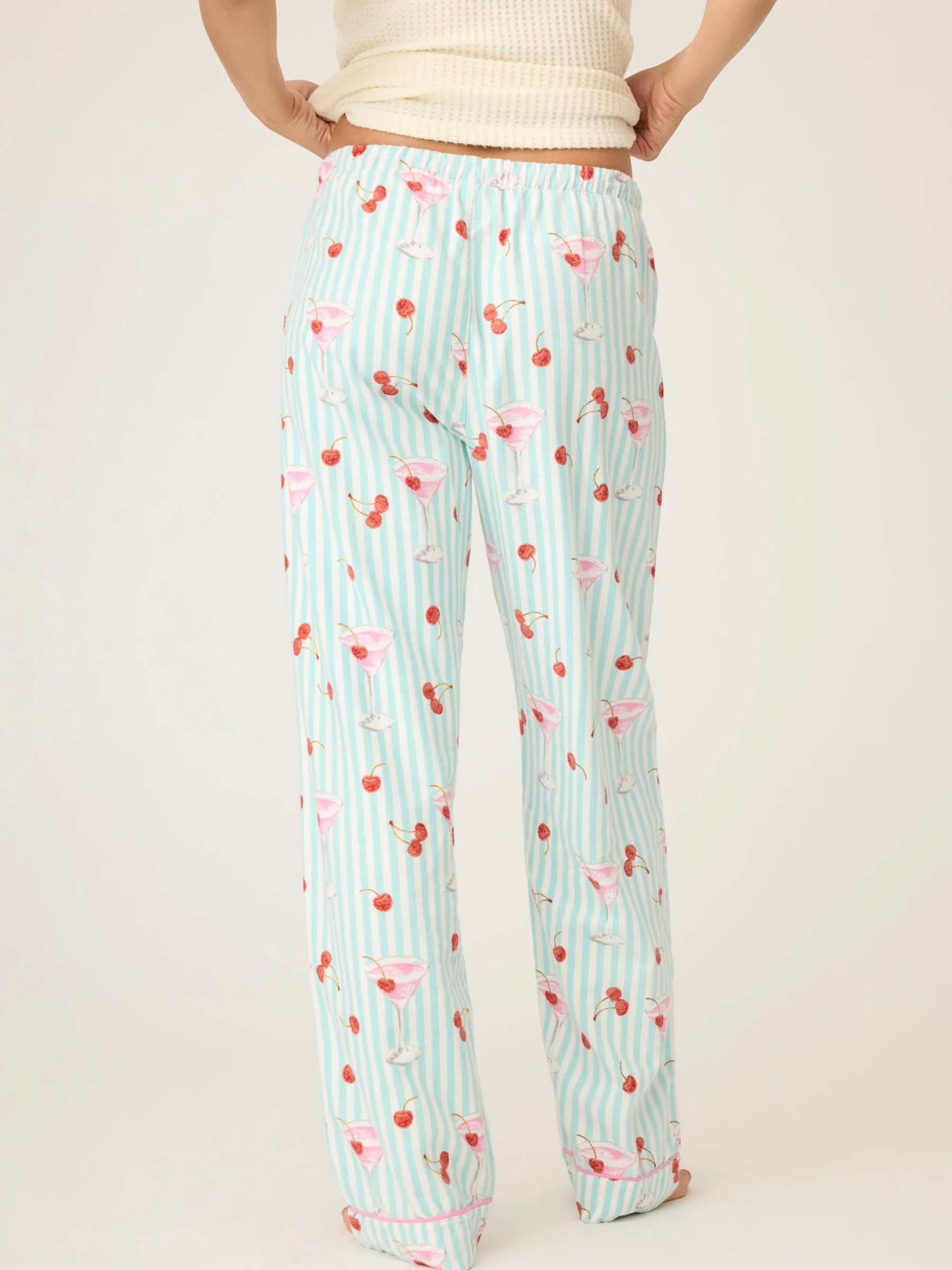 Cozy cotton flannel, meet happy hour. These full-length lounge pants are crafted in a classic twill weave and patterned with minty stripes, pink drinks, and cheery little cherries. Contrast cuffs and piped hems add a playful finish, while the relaxed fit and adjustable drawstring waist make them a dream for slow mornings, sleepy nights, or unwinding with your favorite drink in hand.