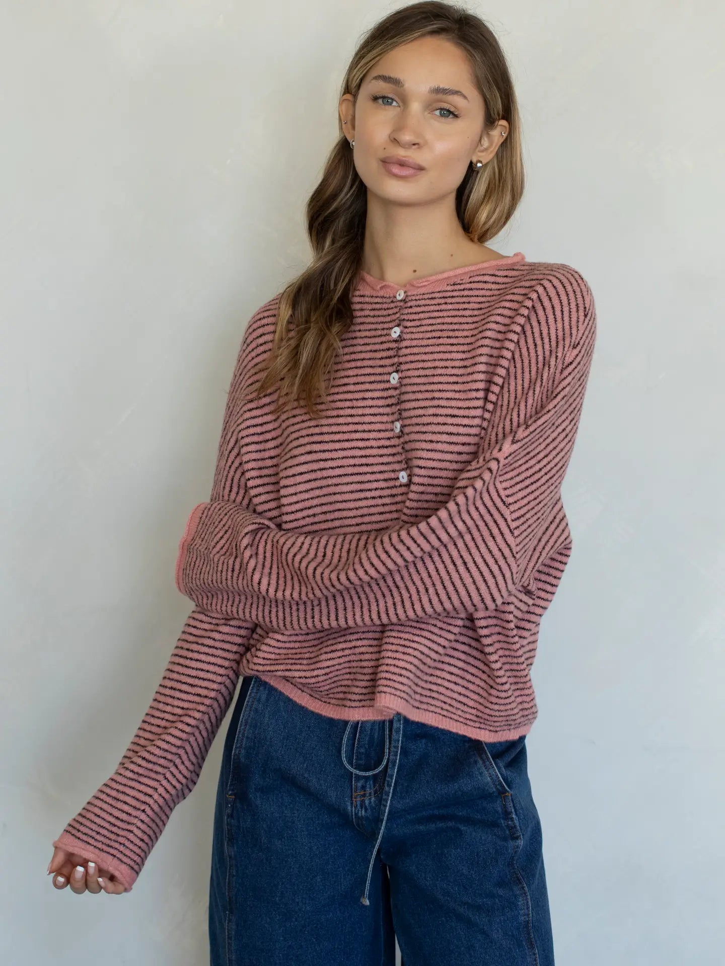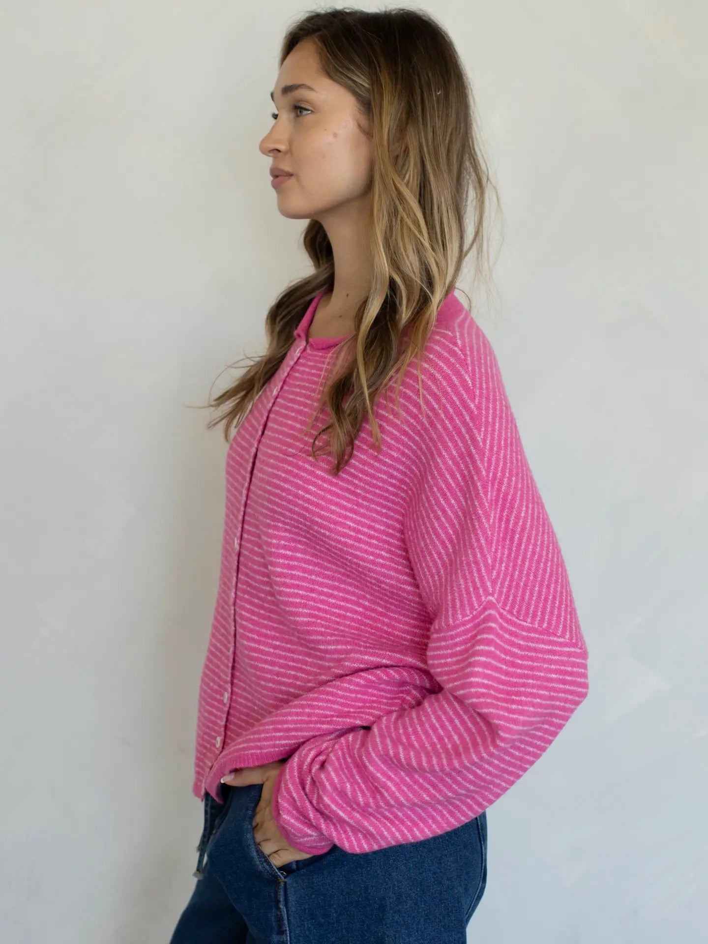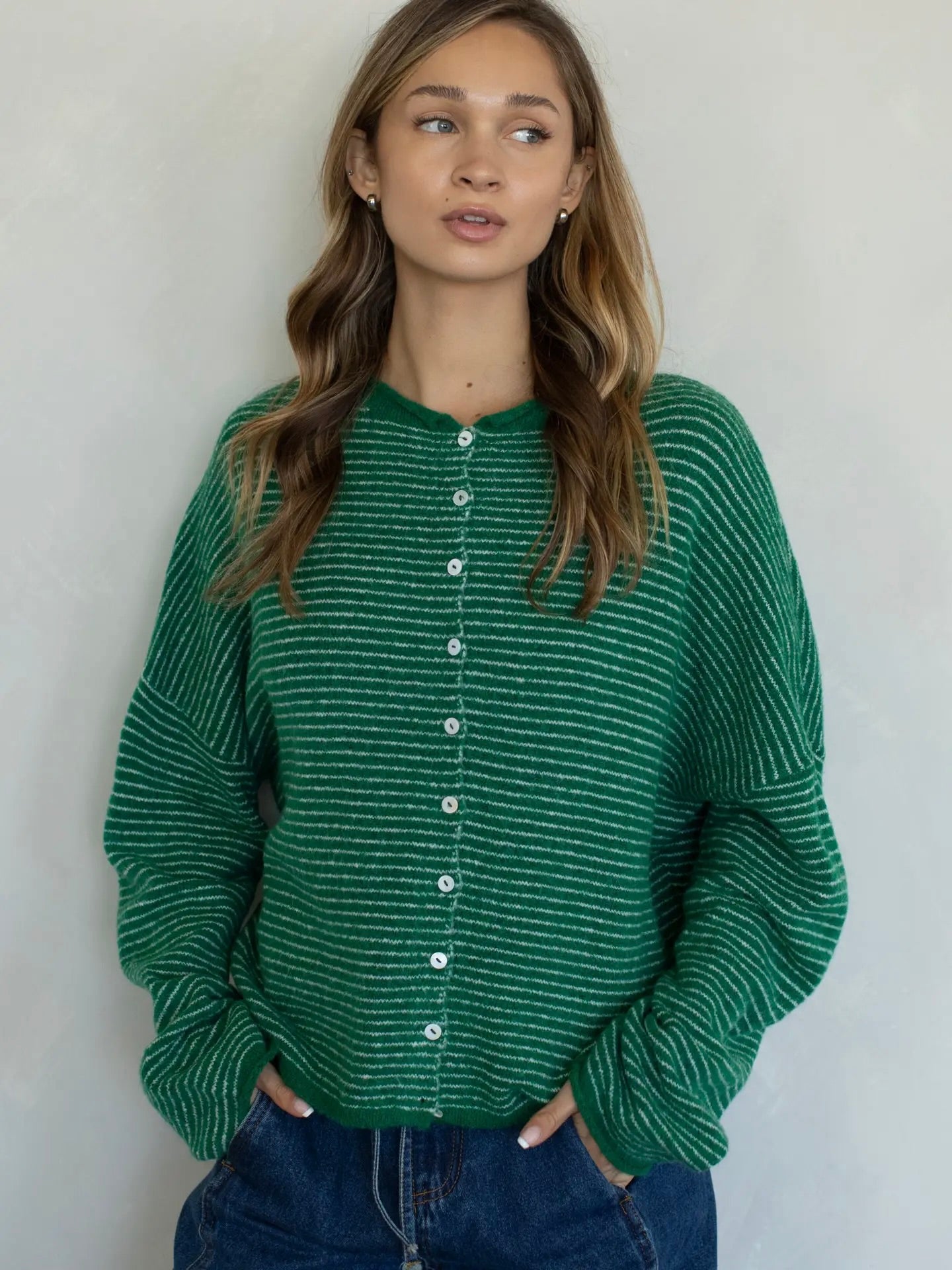 The Piper Pinstripe Cardigan is a timeless classic with a modern touch. Featuring a round neckline and a button-down front, it’s finished with subtle rolled-hem details for extra polish. Its classic fit and refined pinstripe pattern make it a versatile piece that pairs effortlessly with both casual and dressed-up looks.
