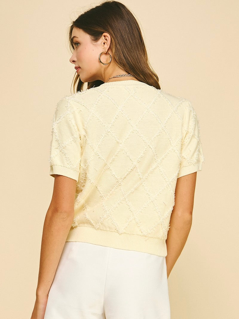 The Textured Diamond Pattern Knit Cardigan is all about subtle style with a playful twist. Soft cotton and a relaxed fit make it easy to layer, while the diamond-knit pattern adds just the right amount of texture. Short sleeves and a button-down front keep it versatile for any season. Pair it with high-waisted denim or a skirt for a casually chic vibe.