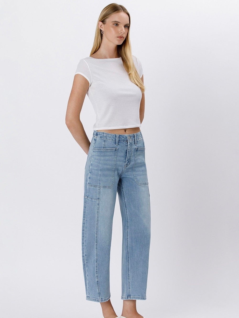 The Super High Barrel Jeans are your go-to for effortless, laid-back style with a modern twist. Crafted from a cotton blend with just a touch of stretch, they sit comfortably at a super-high waist for a flattering fit. The inseam hits right at the ankle, showing off your favorite sneakers or heels. These jeans give a relaxed, slightly flared silhouette that pairs perfectly with everything from tees to tailored tops.