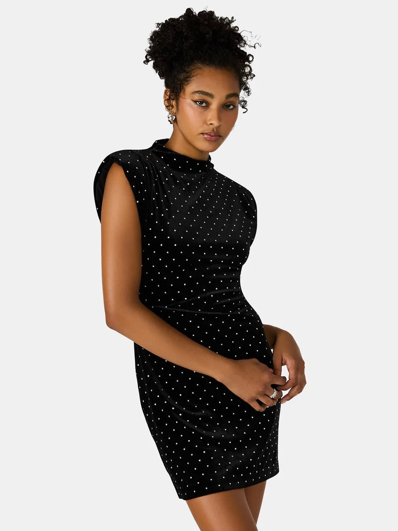 The Astoria Dress is sleek, chic, and made to turn heads. Rhinestone embellishments add just the right amount of sparkle, while the bodycon silhouette and mock neckline keep it polished and modern. Perfect for nights out, parties, or any occasion where you want to shine.