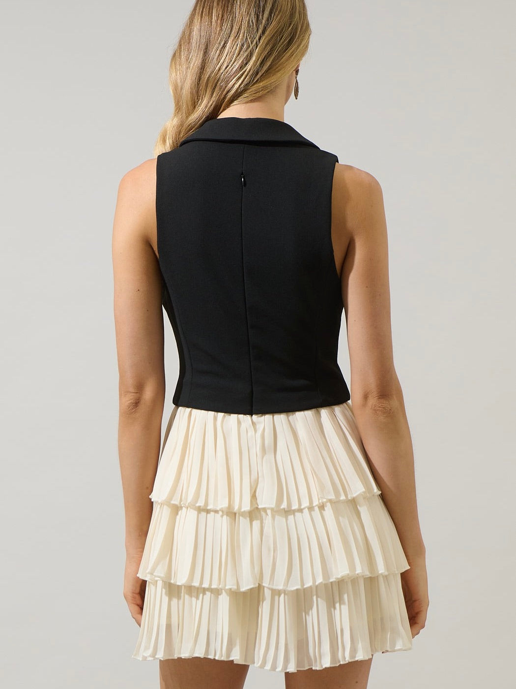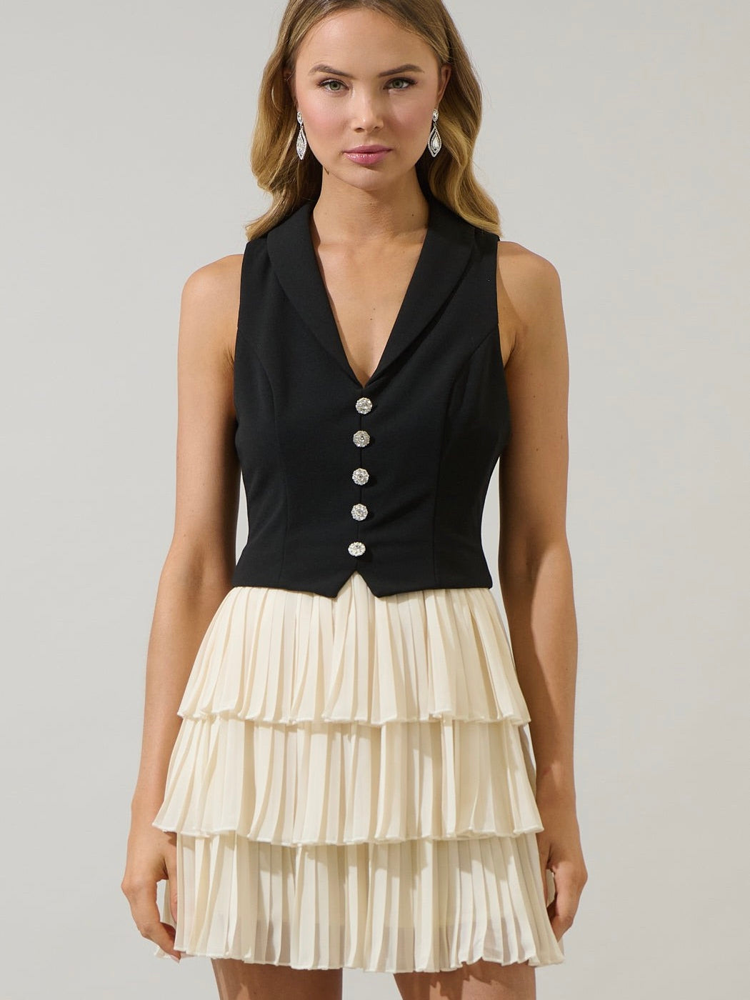 Step out in bold, playful style with the Fadia Atmore Vest Ruffle Mini Dress that makes every moment memorable. This combination of a fitted vest with button up rhinestones lead to a ruffle tiered mini skirt. The back has an invisible zipper. Pair it with strappy heels, a sleek clutch, and statement earrings for a showstopping look