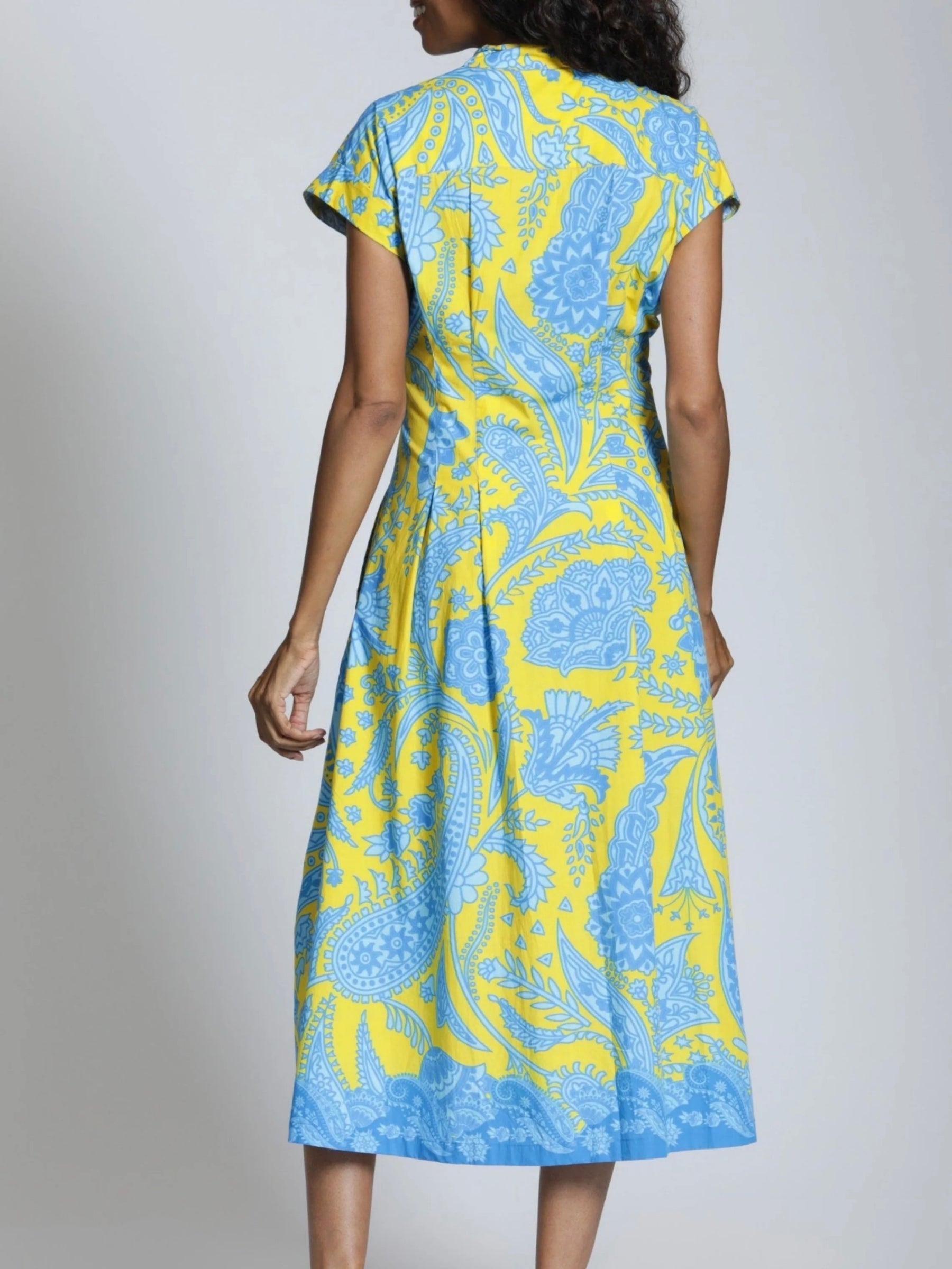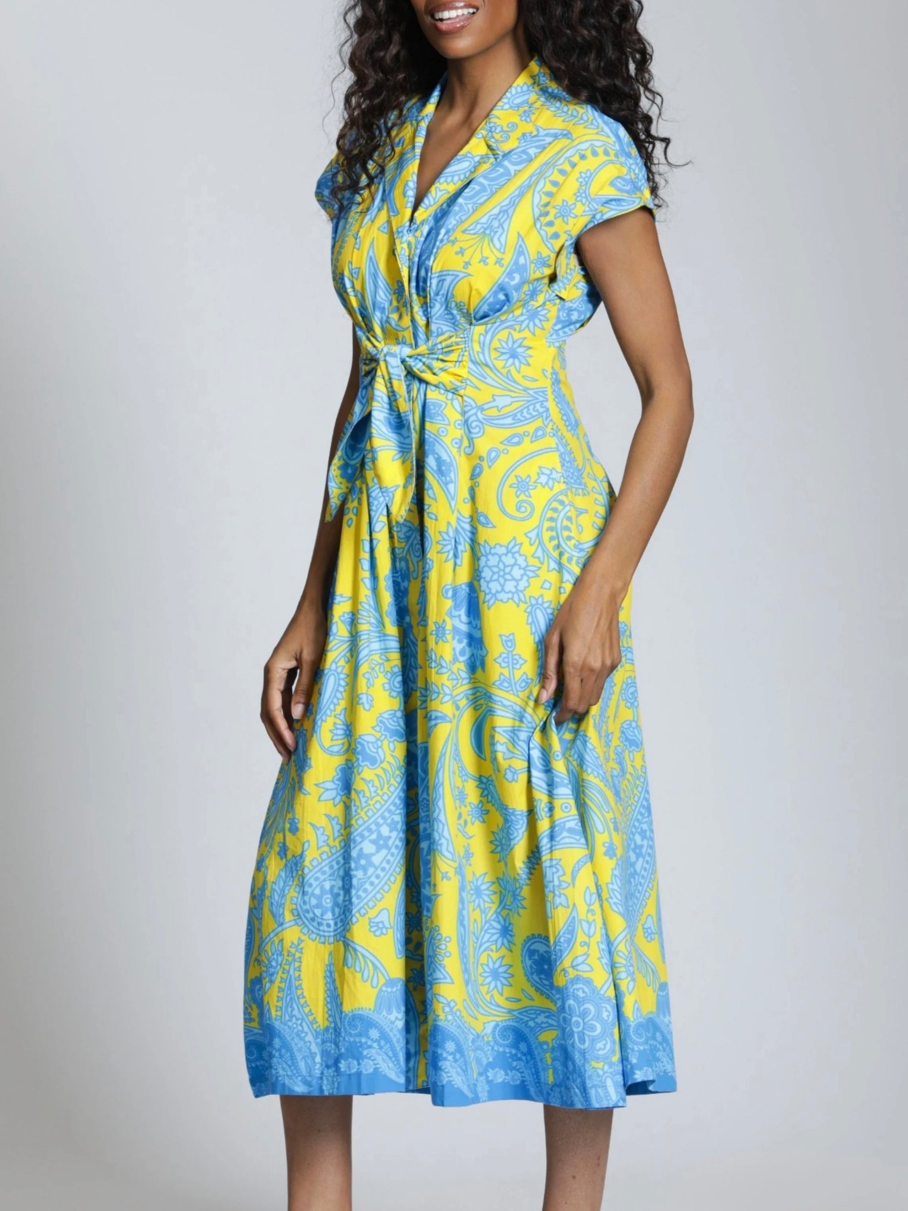 The Printed Tie Front Dress is an effortlessly chic midi with a flattering, tailored feel. It features a banded collar, button-down front, and structured cap sleeves with soft shoulder gathering for subtle shape. The self-tie belt cinches the waist just right, flowing into an easy A-line skirt with side pockets for everyday ease. It’s the kind of piece that looks polished enough for plans but still feels completely relaxed.