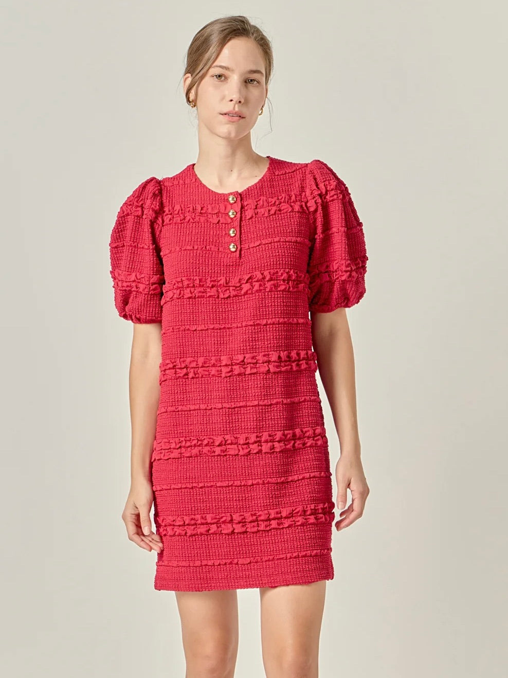 The perfect combination of chic and playful this dress is designed with a round neckline puffed short sleeves and smocked details that hug your curves in all the right places. The front placket adorned with gold buttons adds a touch of elegance to this playful piece. This versatile dress is perfect for any occasion and can easily transition from day to night. Made with high-quality materials this dress is both comfortable and stylish. Don't miss out on this unique and trendy dress.
