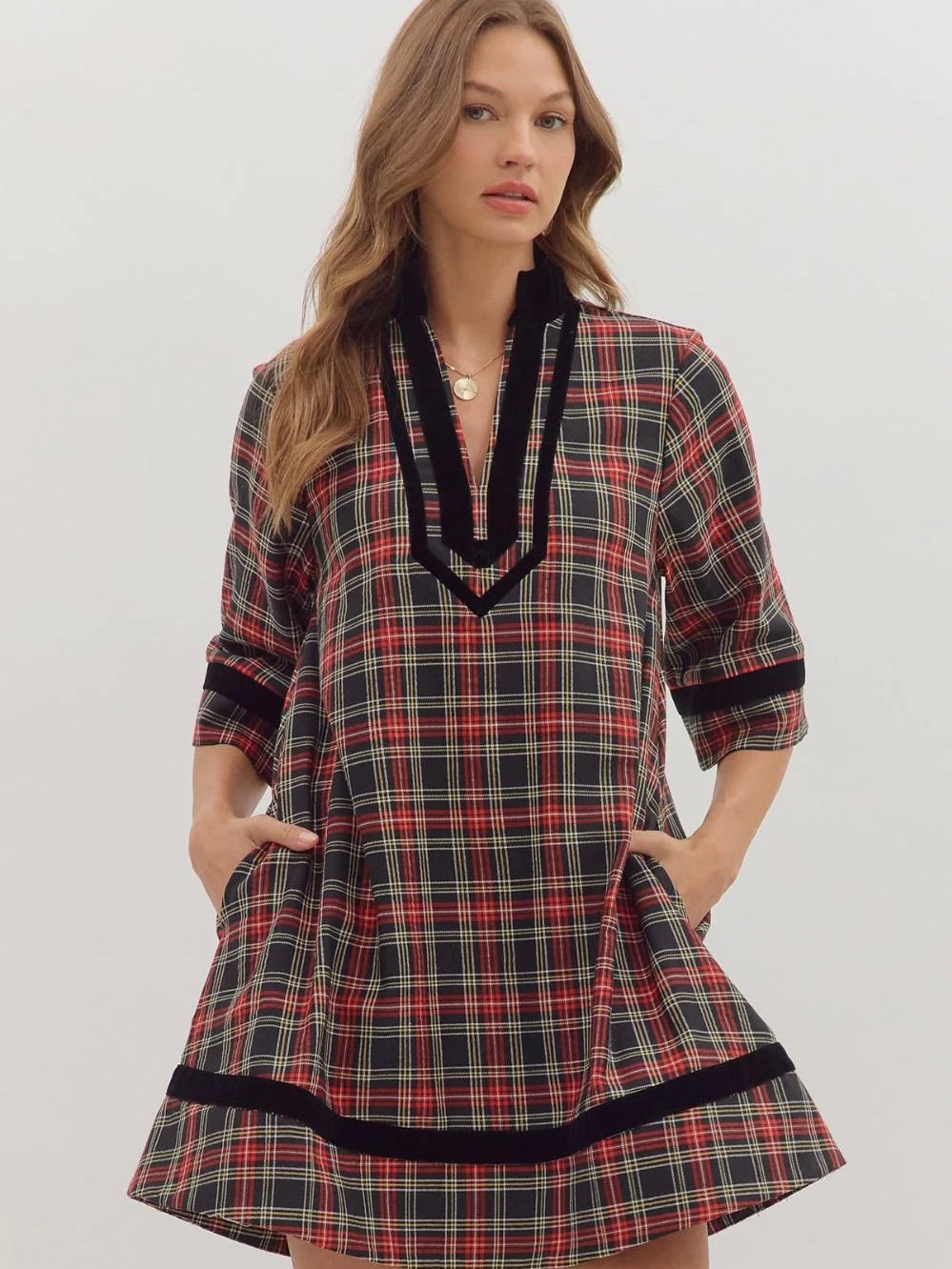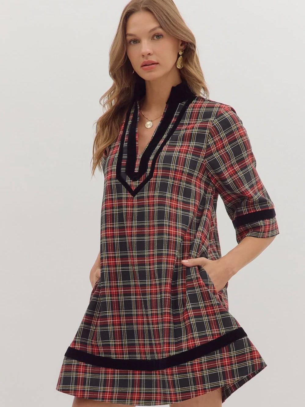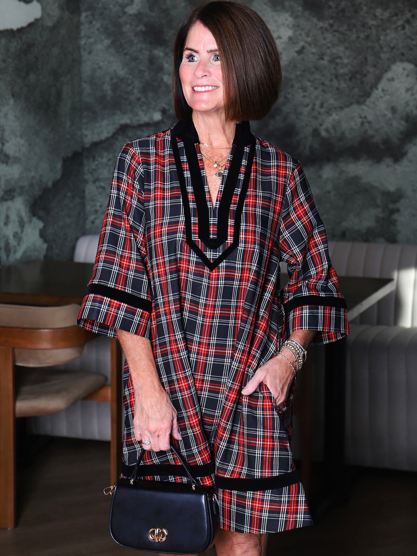 The Sienna Dress is effortlessly chic with a playful twist. A flattering V-neckline and velvet-trimmed details add a touch of luxe, while side pockets keep it practical. Perfect for holiday gatherings or any occasion where you want to look polished and festive.