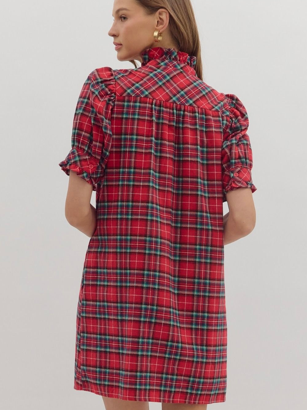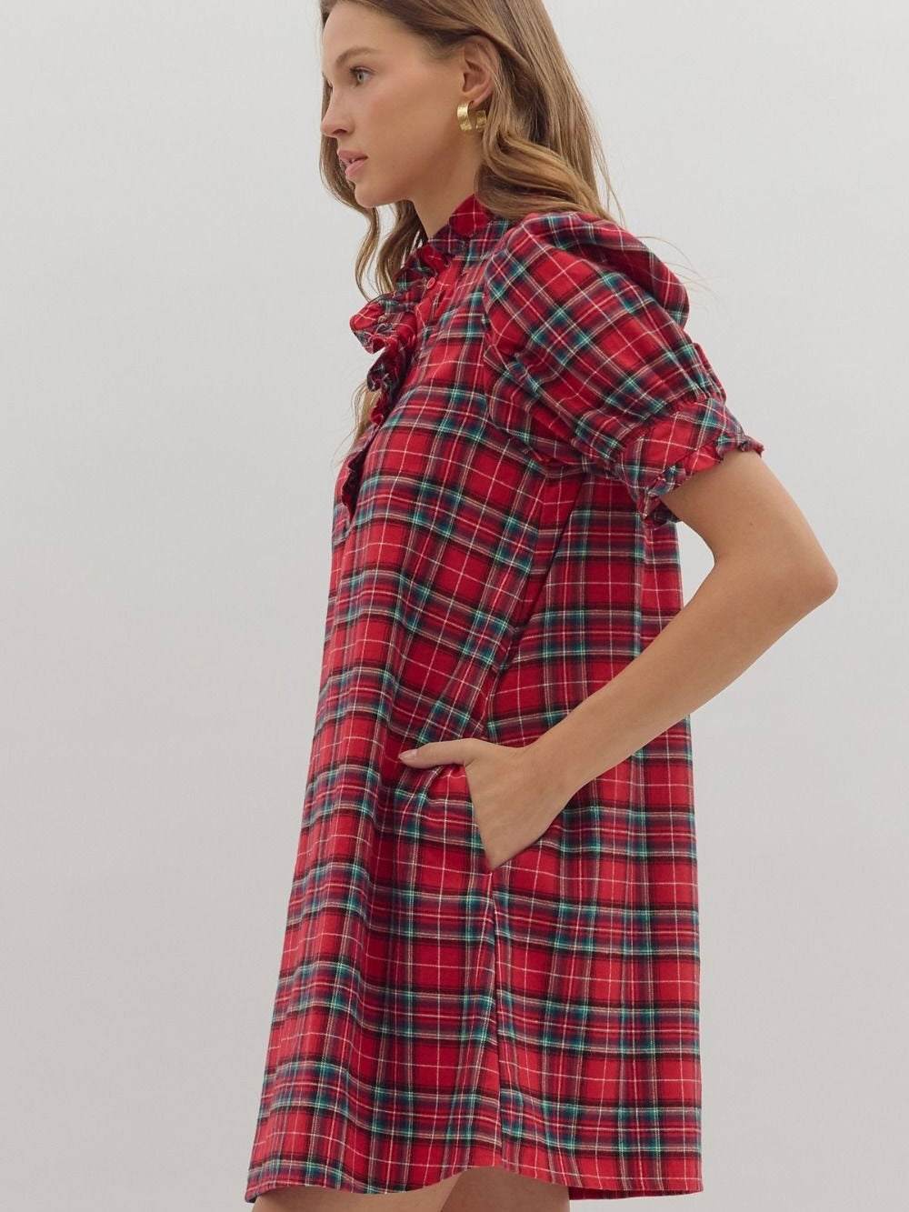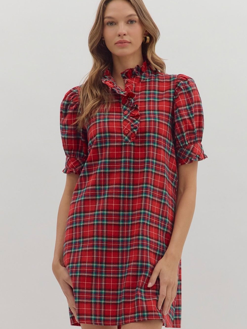 The Stewart Dress is playful, polished, and effortlessly chic. Its ruffled mock neckline, short puff sleeves, and button-front detail add flirty, feminine charm. Side pockets keep it practical while the above-the-knee length keeps it fun and flirty. Pair with boots or flats for a look that’s ready for brunch, errands, or anything in between.