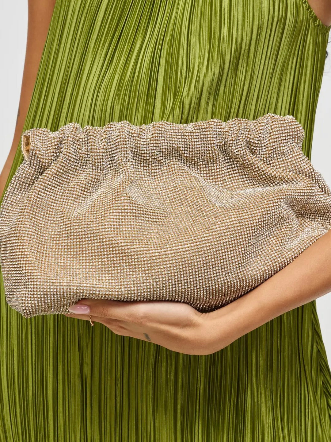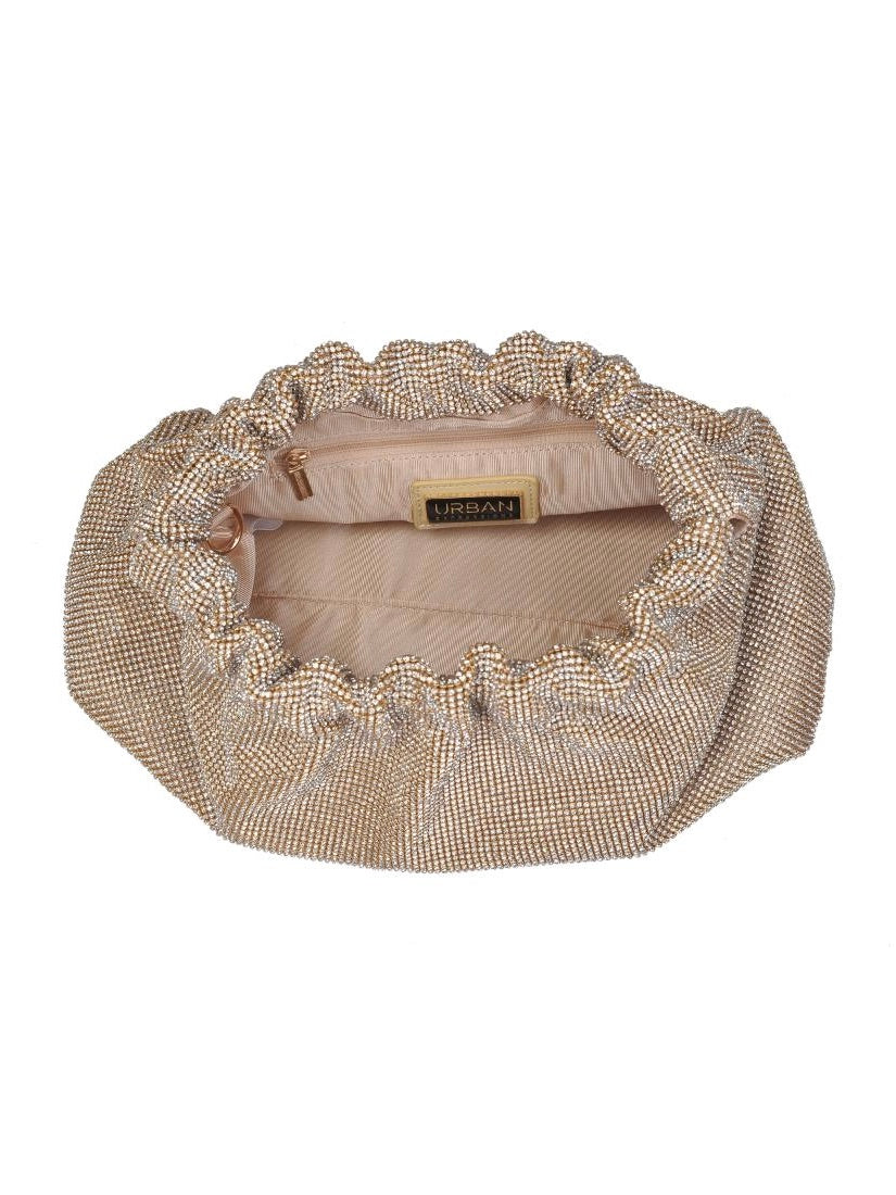 - Exterior Details: Detachable Chain Strap, Rhinestones All-over, Ruched Design