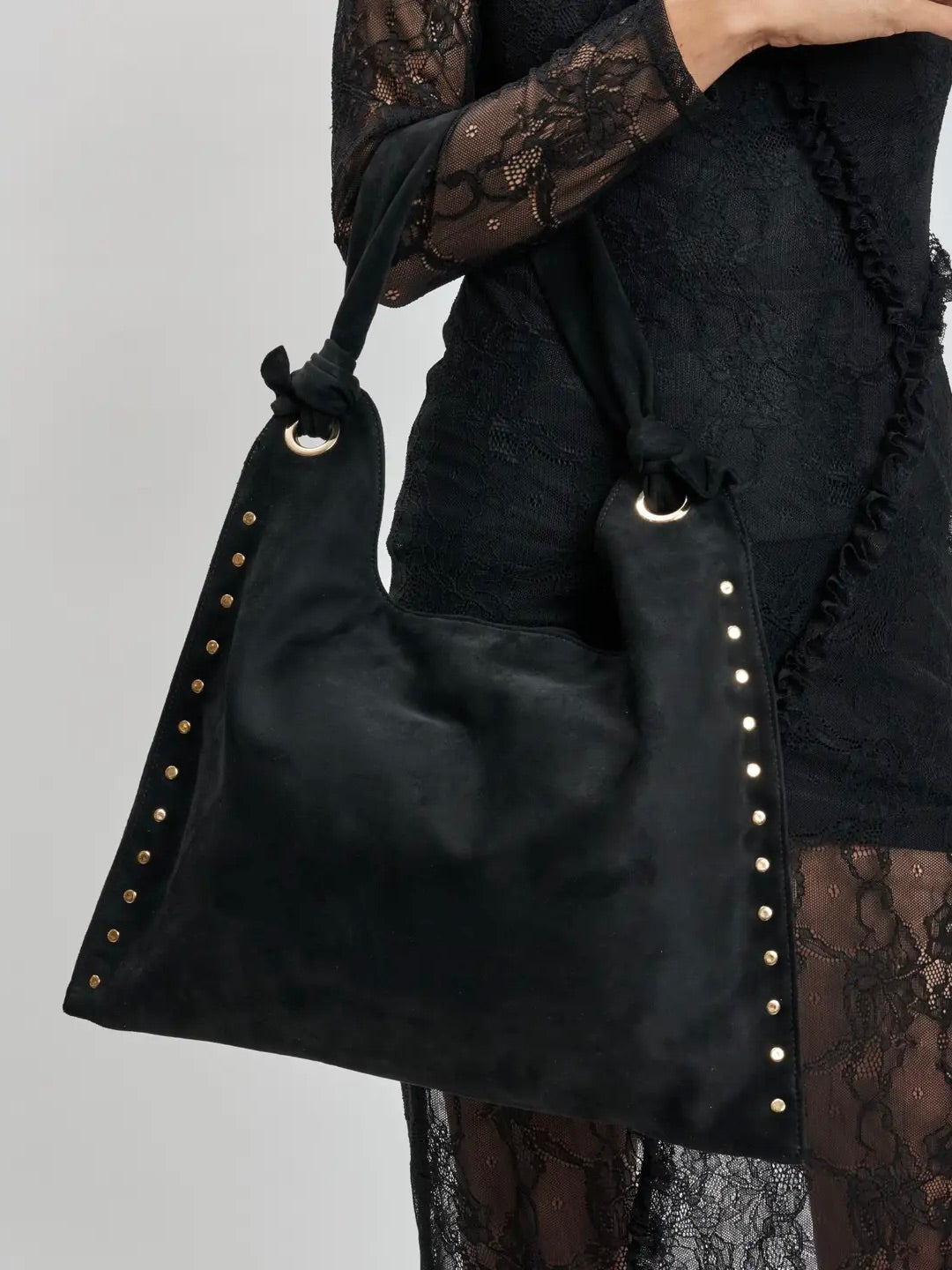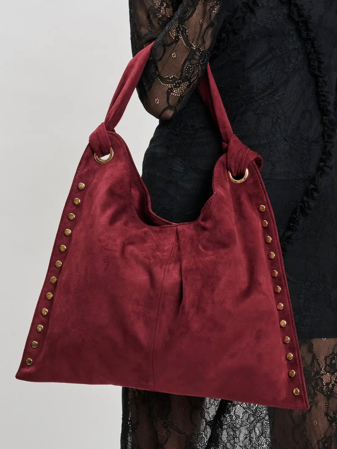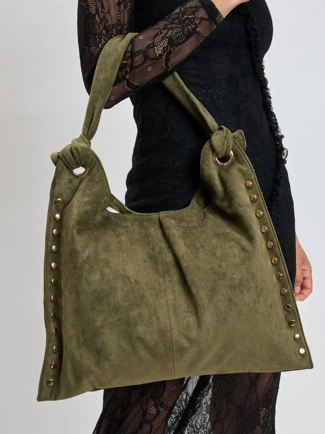 Unveil effortless charm with the Meadow Hobo, designed for the modern woman who values both style and functionality. This spacious bag features a soft, plush exterior complemented by chic studded detailing, making it perfect for any occasion. The unique knotted handles provide a comfortable grip, while the thoughtfully organized interior ensures you can carry your essentials with ease. Ideal for transitioning from day to night, this bag effortlessly enhances your look—whether paired with casual wear or elegant attire. Elevate your accessory game and embrace the perfect blend of trendiness and timelessness with the Meadow Hobo.