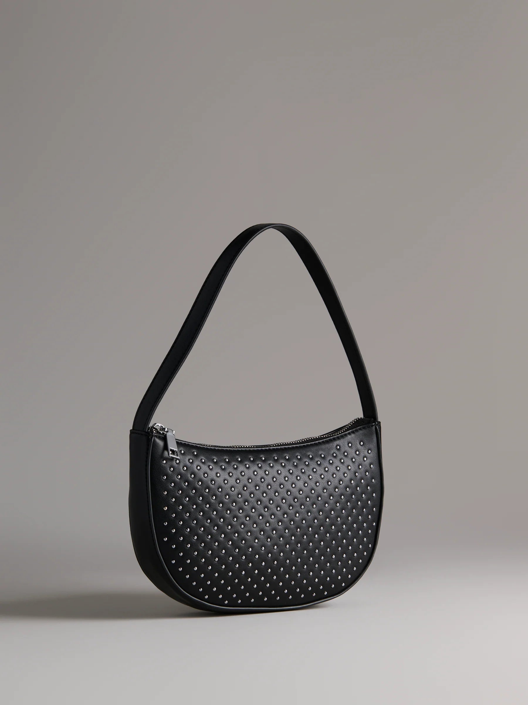 Add a little sparkle to your everyday look with the Roxy Shoulder Bag. This sleek faux leather shoulder bag features an arched silhouette covered in petite, polished studs for just the right amount of edge. With a top zip closure, inner zip pocket, and two slip pockets, it keeps your essentials organized and secure. Compact and chic, it’s perfect for nights out, brunch dates, or anytime you want your outfit to shine.