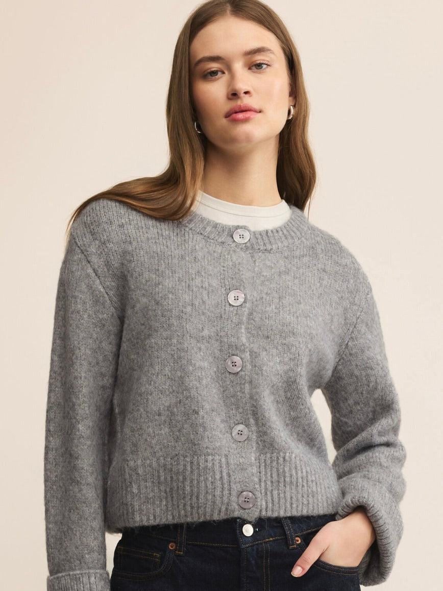 Brushed mohair yarns give this cropped button-front cardigan its soft, cloudlike feel. A modern take on a classic, it’s perfect for layering or wearing as a top with denim.