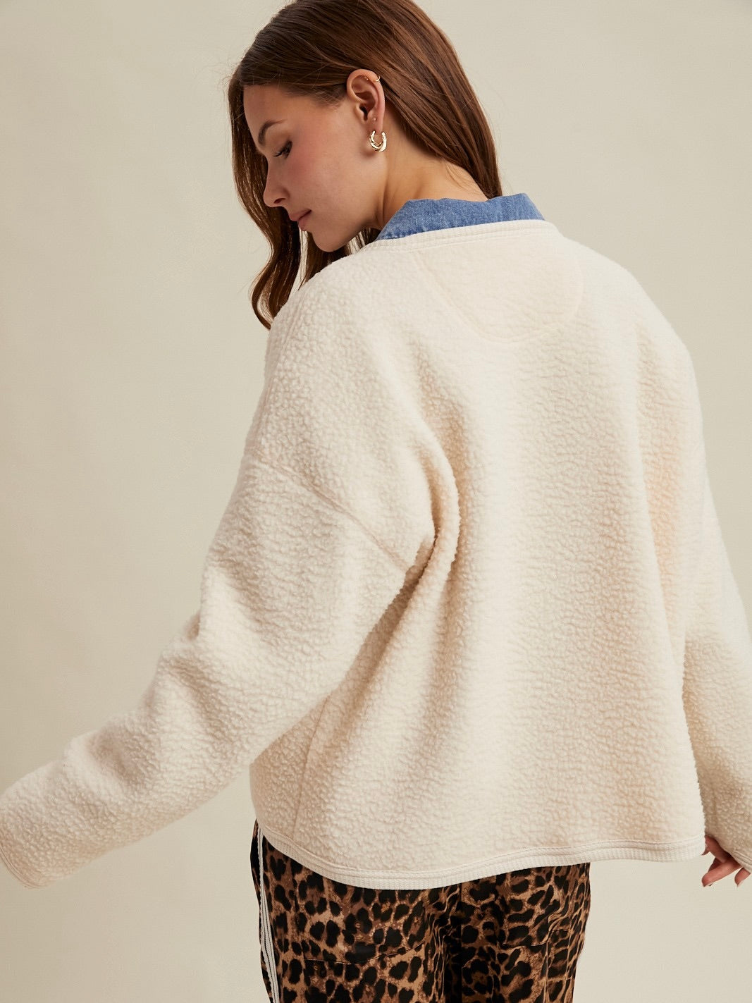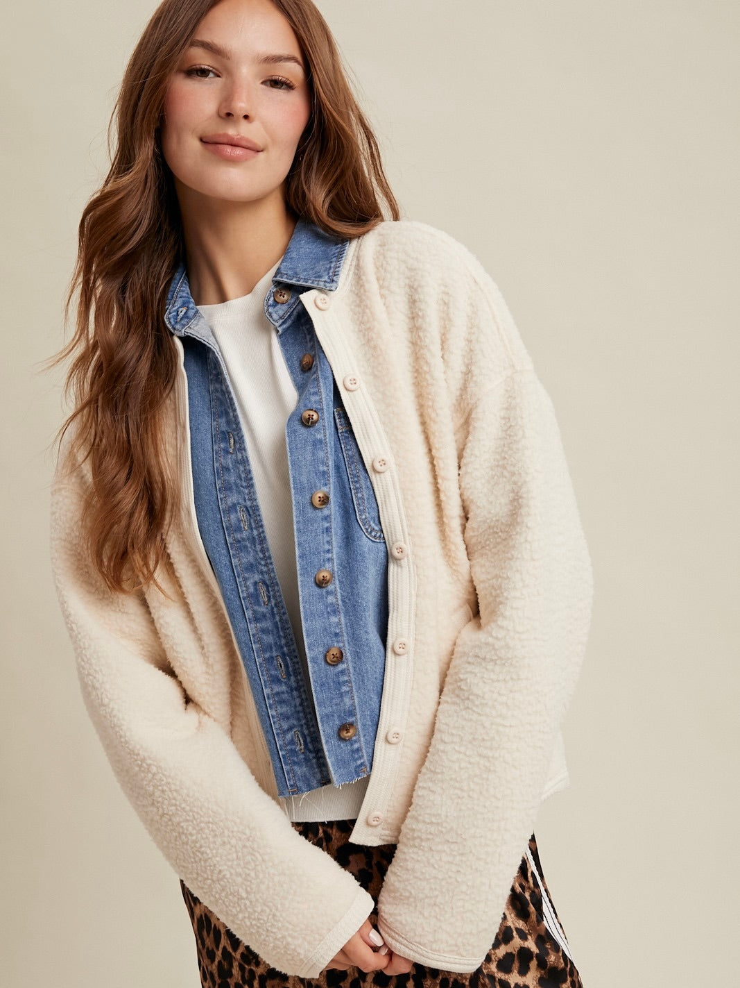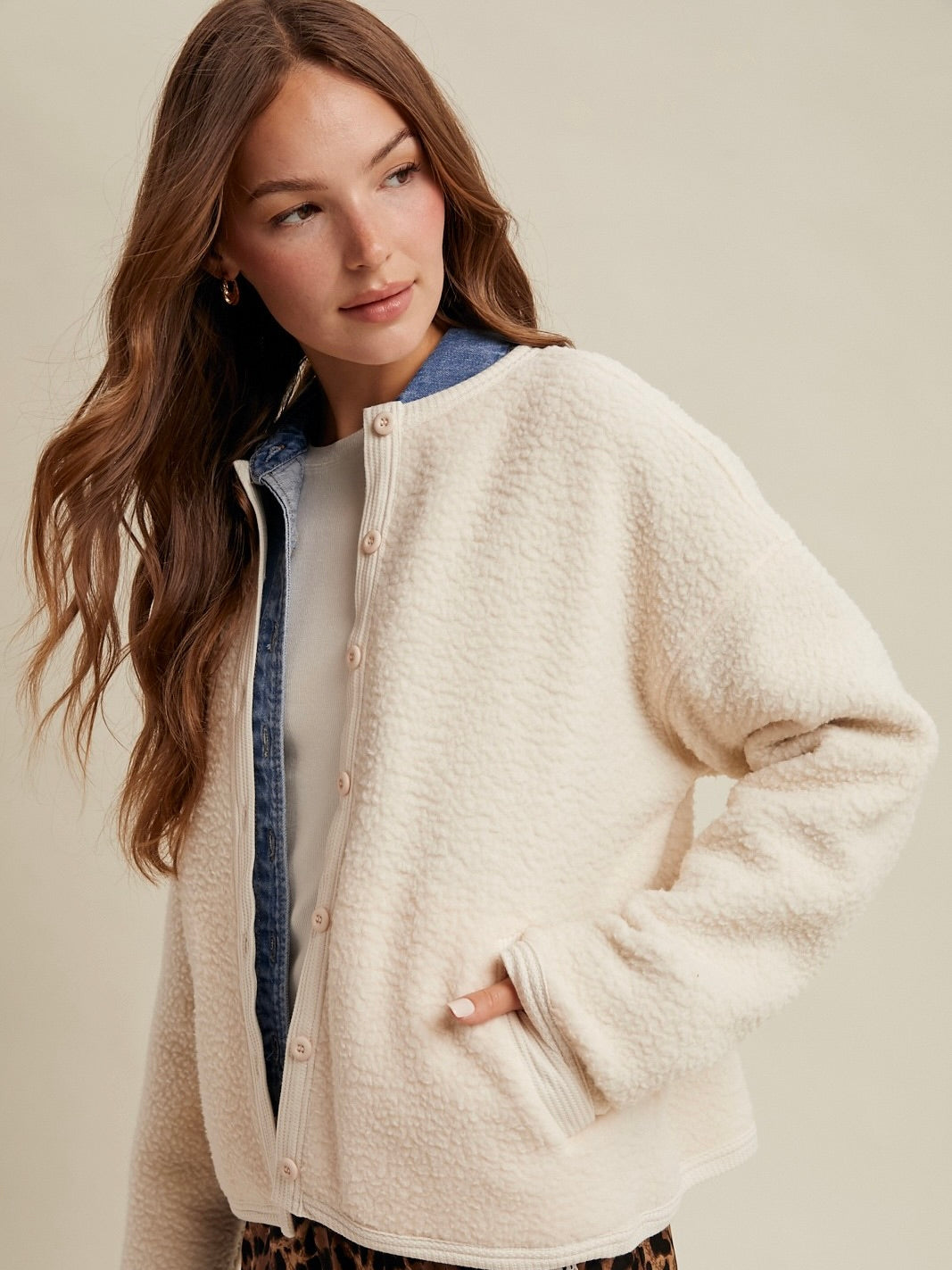 The Anya Sherpa Jacket is your go-to for instant warmth and style. Wrapped in plush softness, it’s made for chilly days when you want to stay cozy without sacrificing a polished look. A cold-weather essential you’ll never want to take off.