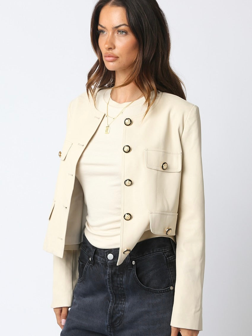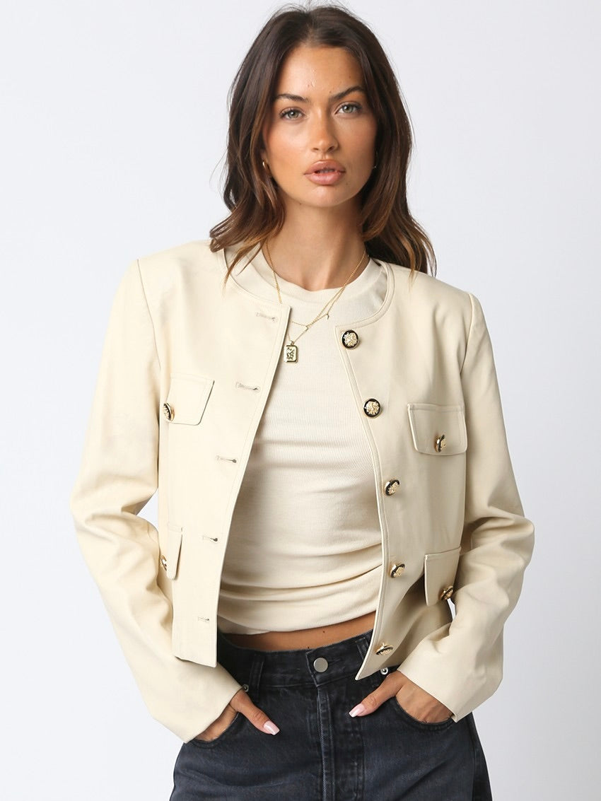 The Dhanna Jacket is effortlessly cool with a polished, utilitarian vibe. Front chest pockets and a button-down front add practical style, while the round neckline and long sleeves keep it classic. Perfect for layering over tees or sweaters for an everyday, put-together look