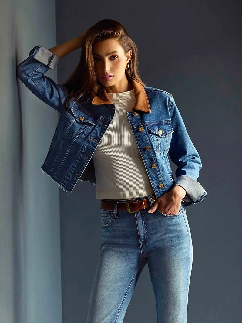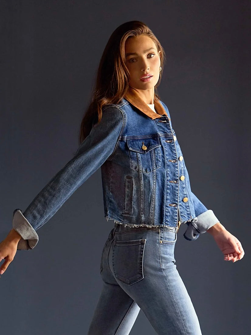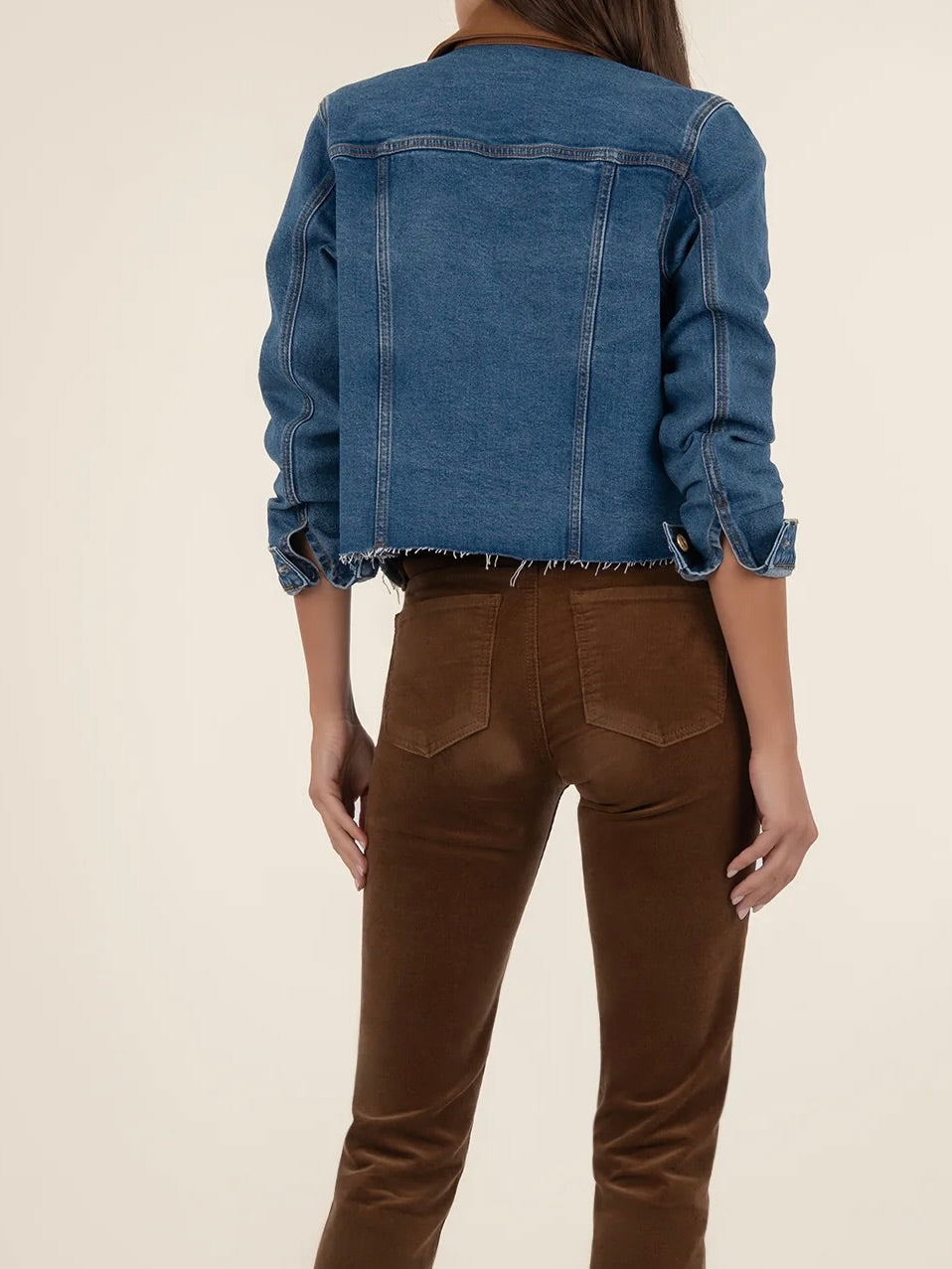 A classic layer with a twist. This cropped denim jacket features a raw hem and a contrasting suede collar for an unexpected mix of texture and edge. The perfect piece to elevate your casual look with subtle detail.