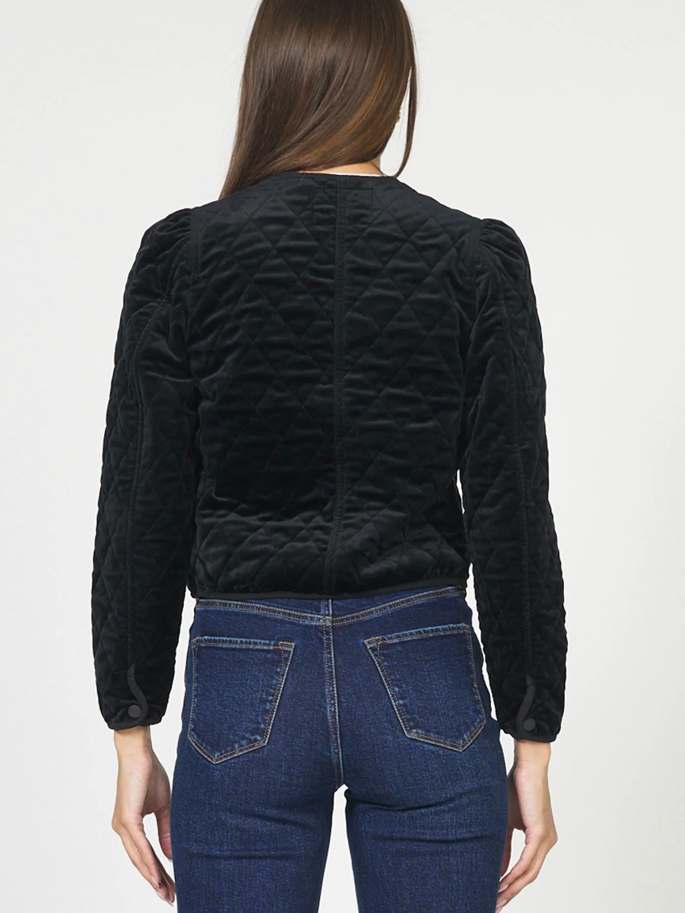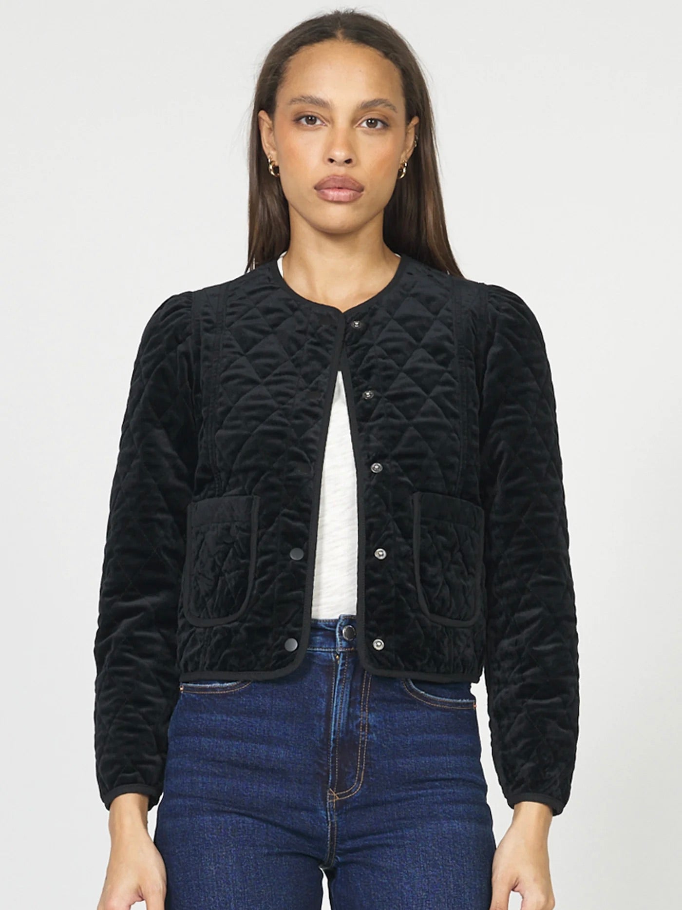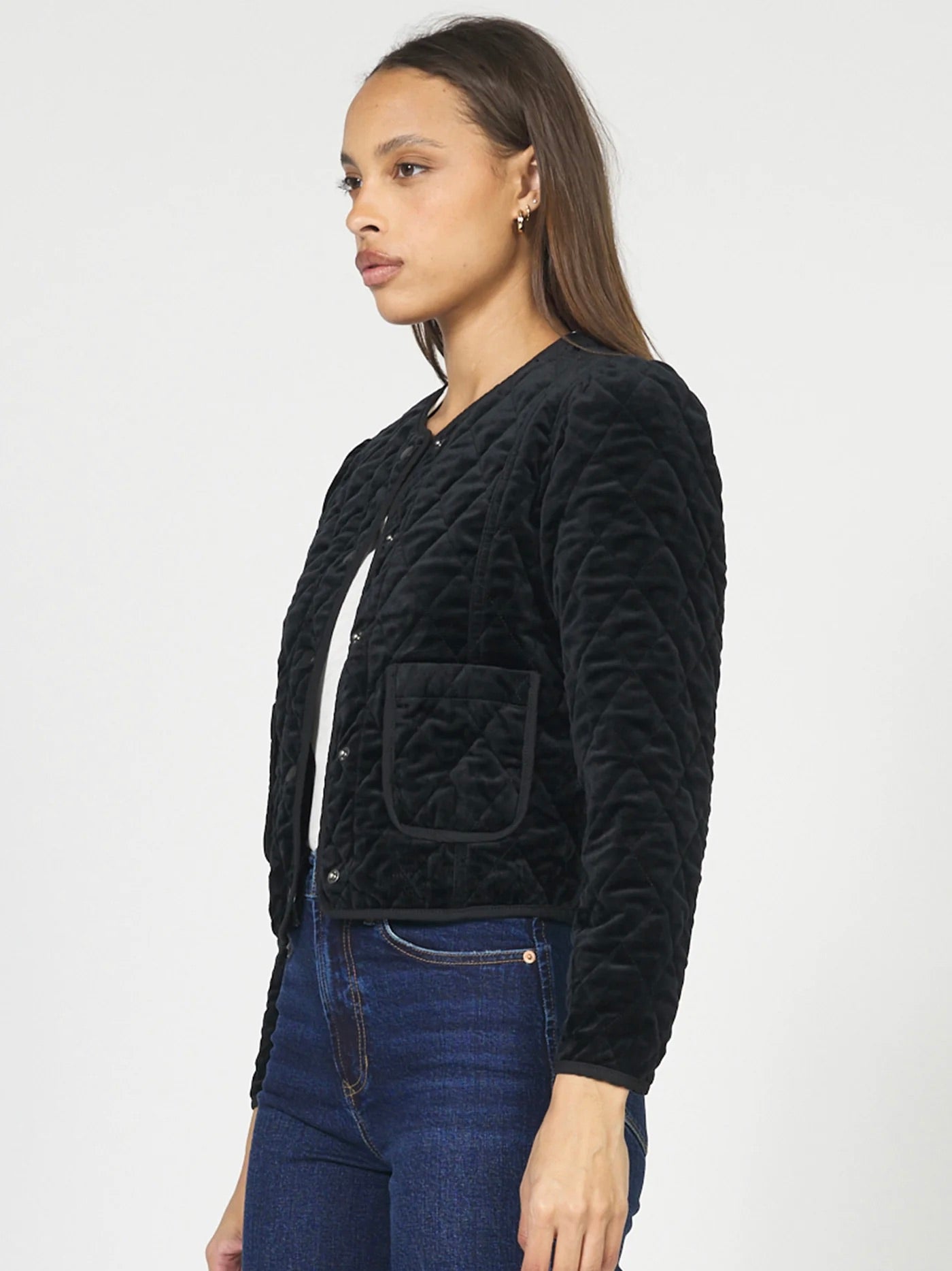 Elevate your outerwear with the Kit Jacket, featuring a luxurious velvet finish and a refined round neck design. This collarless jacket offers a relaxed fit for effortless comfort, complemented by snap button closures that add subtle sophistication. Its quilted texture provides lightweight warmth, making it an ideal choice for layering in style.
