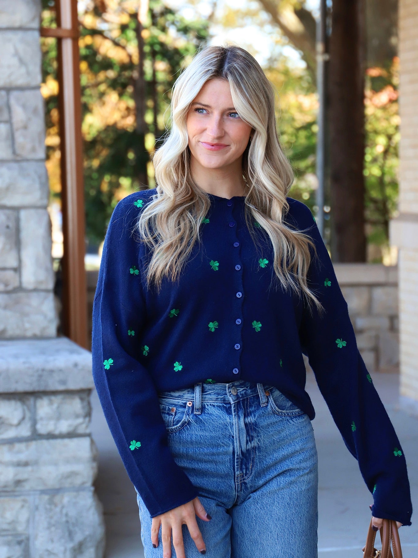 The Larkin Embroidered Shamrock Cardigan is festive, cozy, and full of personality. Designed by our VC team, it features a round neckline, button-down front, and classic fit, with a charming shamrock embroidery and rolled hem detail. Perfect for layering over tees or blouses for a playful, spirited look.