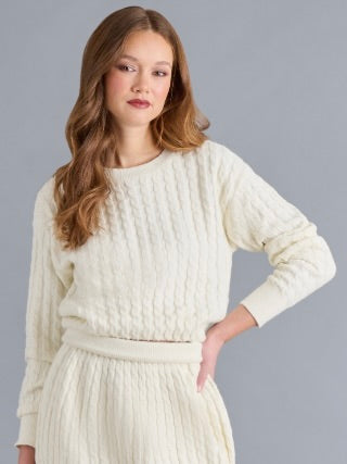 The Minna Sweater brings classic cozy vibes with a modern twist. Its cable-knit design, crewneck, and ribbed cuffs add texture and charm, while the wide ribbed hem keeps it polished. Pull it on over jeans or skirts for effortless style. A timeless piece that makes layering feel easy and chic.