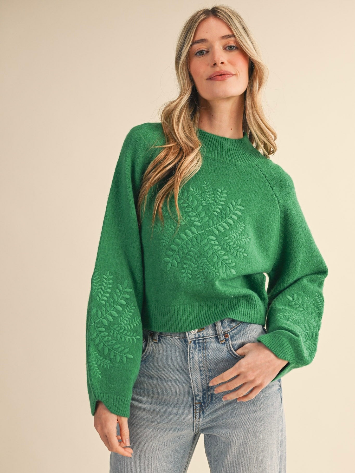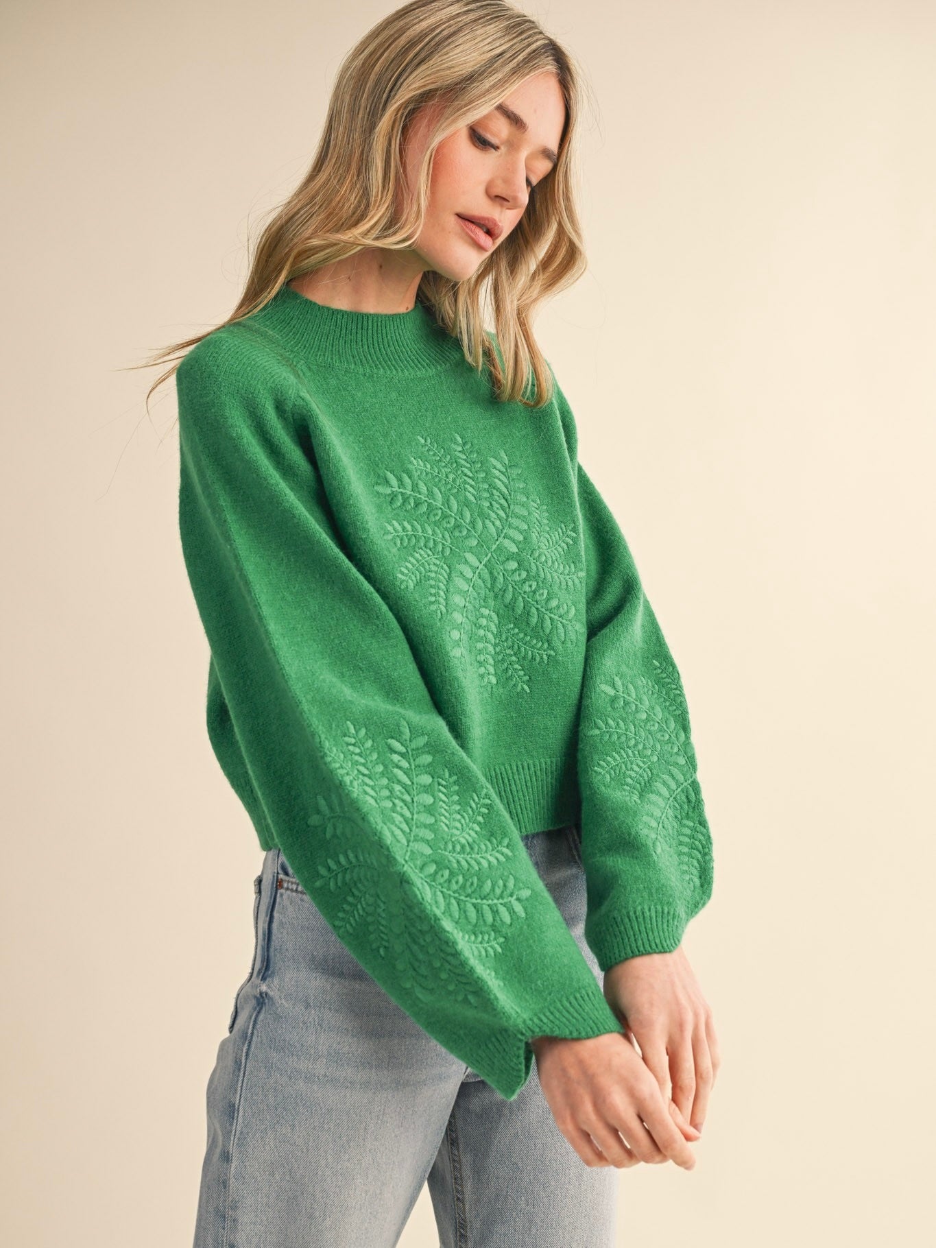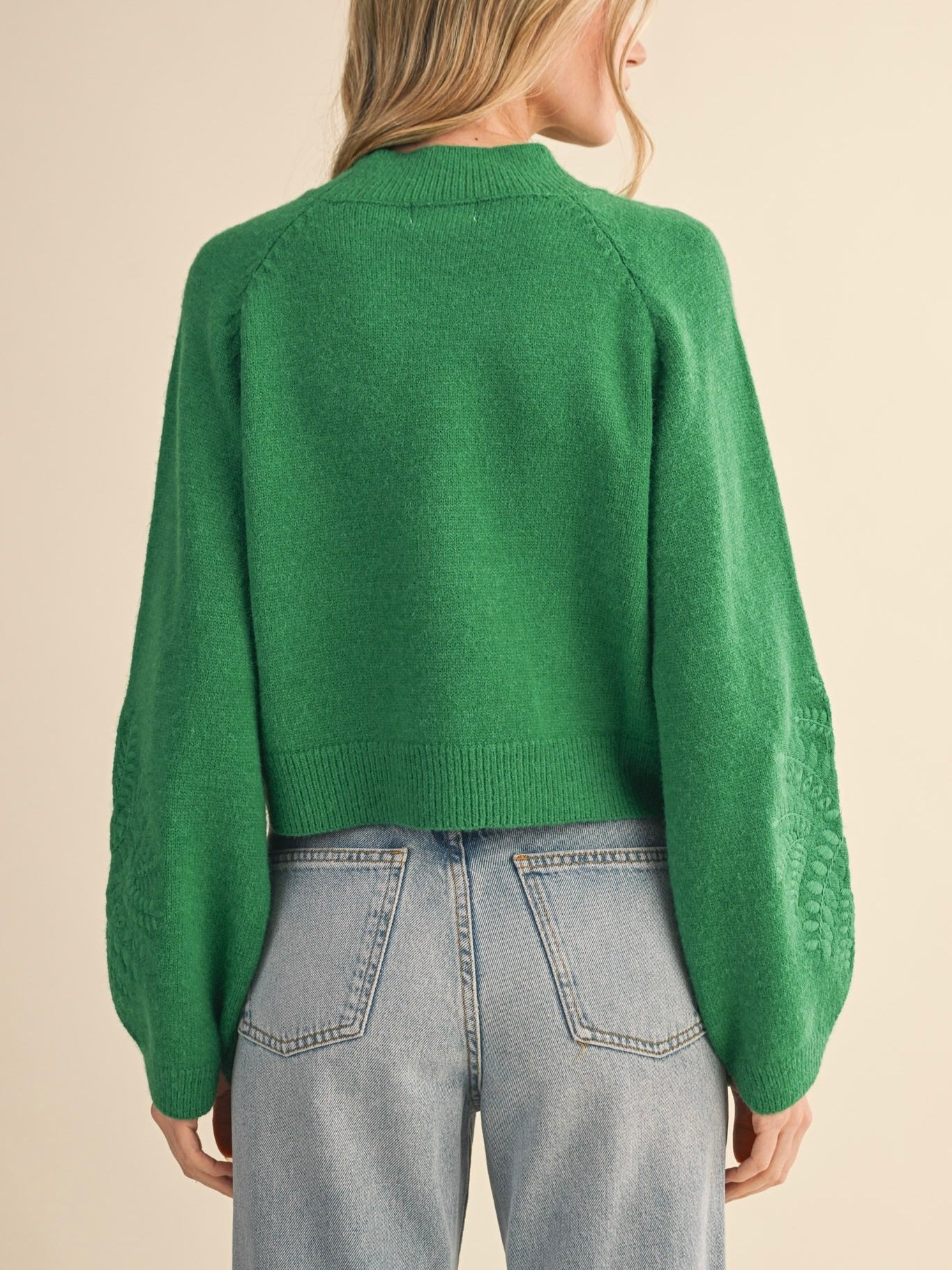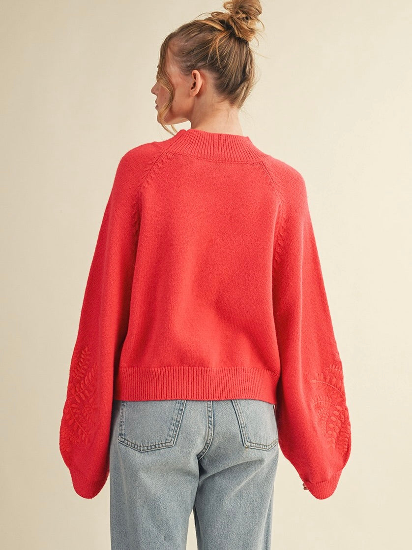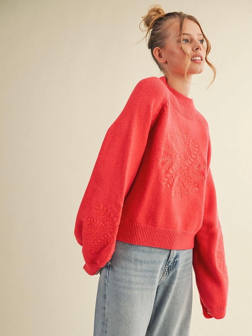 The Heather Embroidered Sweater is cozy with a whimsical touch. Ribbed mock neck and balloon sleeves add soft, playful volume, while delicate embroidery brings subtle charm. Perfect for pairing with jeans or skirts for a polished, everyday look.