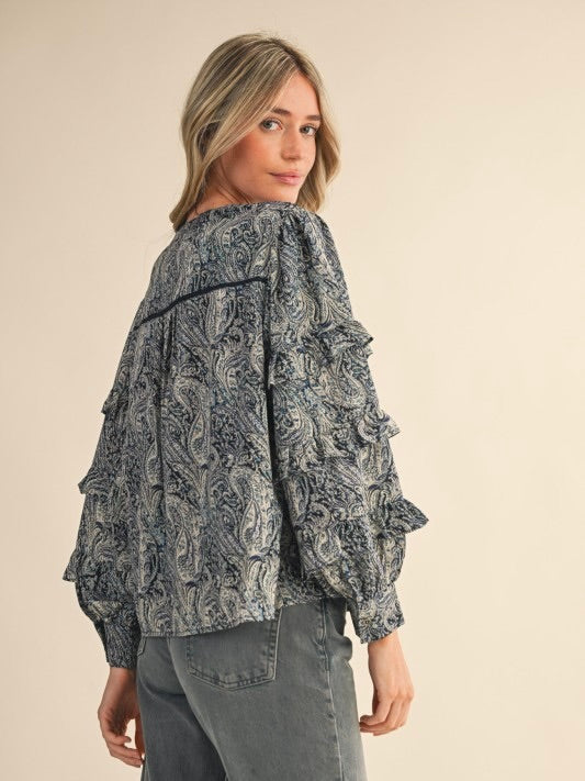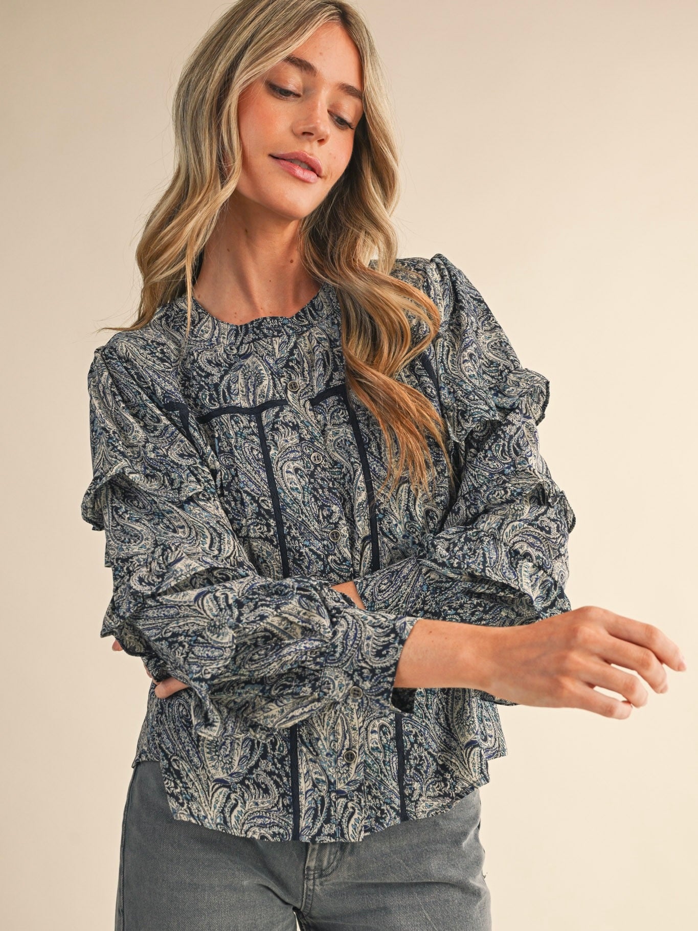 The Britney Top is sweet, chic, and effortlessly feminine. Featuring a round neckline and statement ruffled sleeves, it brings a playful twist to a timeless button-down silhouette. Pair it with denim or trousers for a look that’s polished with a touch of flair.