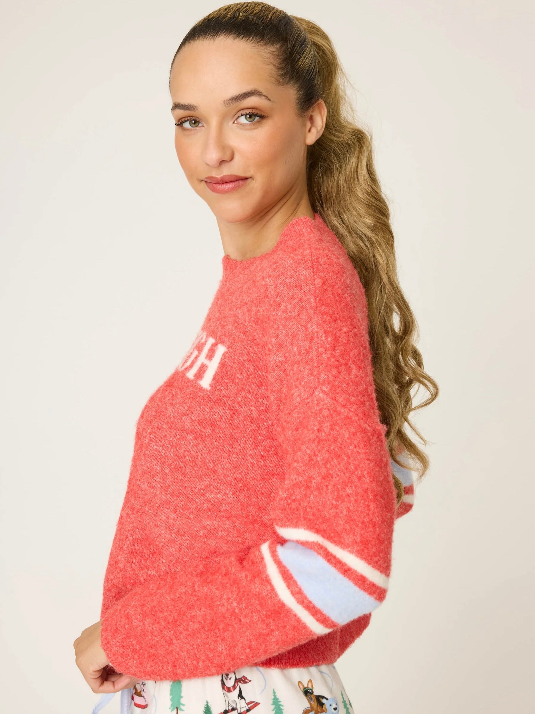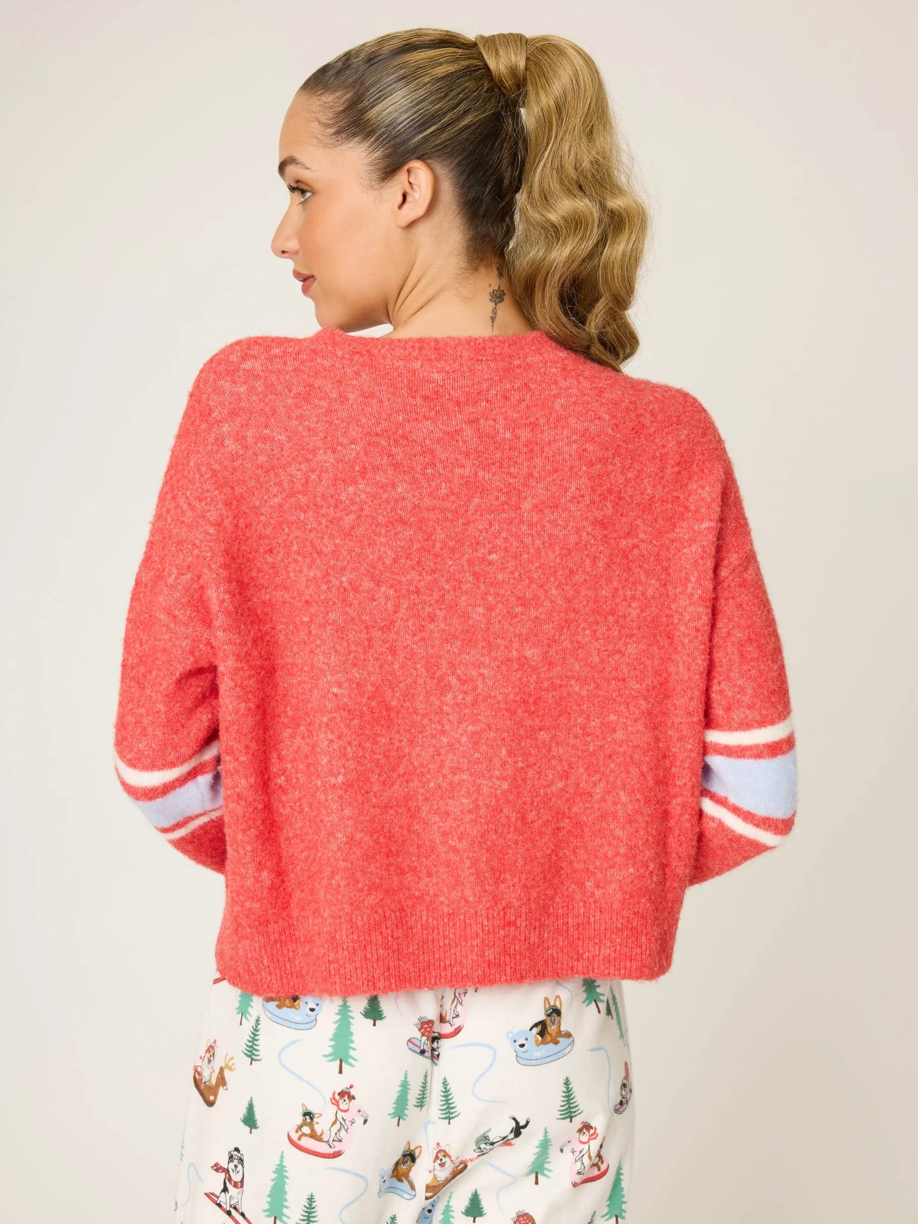 Sleigh all day in this festive pullover. Crafted in a cozy, fuzzy knit with an easy, relaxed fit, it’s designed with bold varsity-striped sleeves and a cheeky holiday graphic across the front. The perfect piece to pull on for tree-trimming, gift-wrapping, or curling up fireside with a seasonal sip in hand.