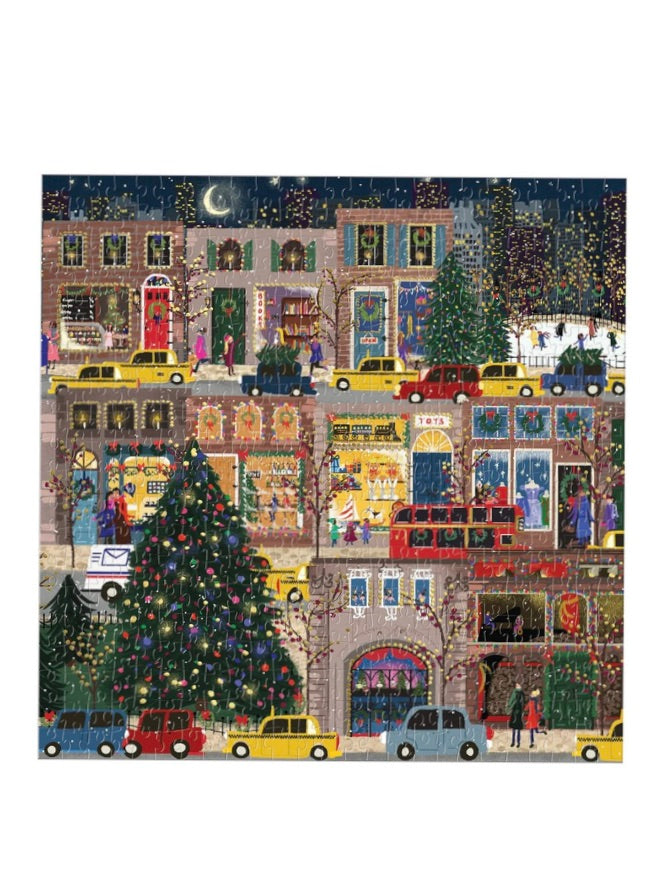 Put together the Winter Lights Foil 500 piece puzzle from Galison to reveal a fun night time image of a vibrant city all lit up and decorated for the holiday season. Art by Joy Laforme.