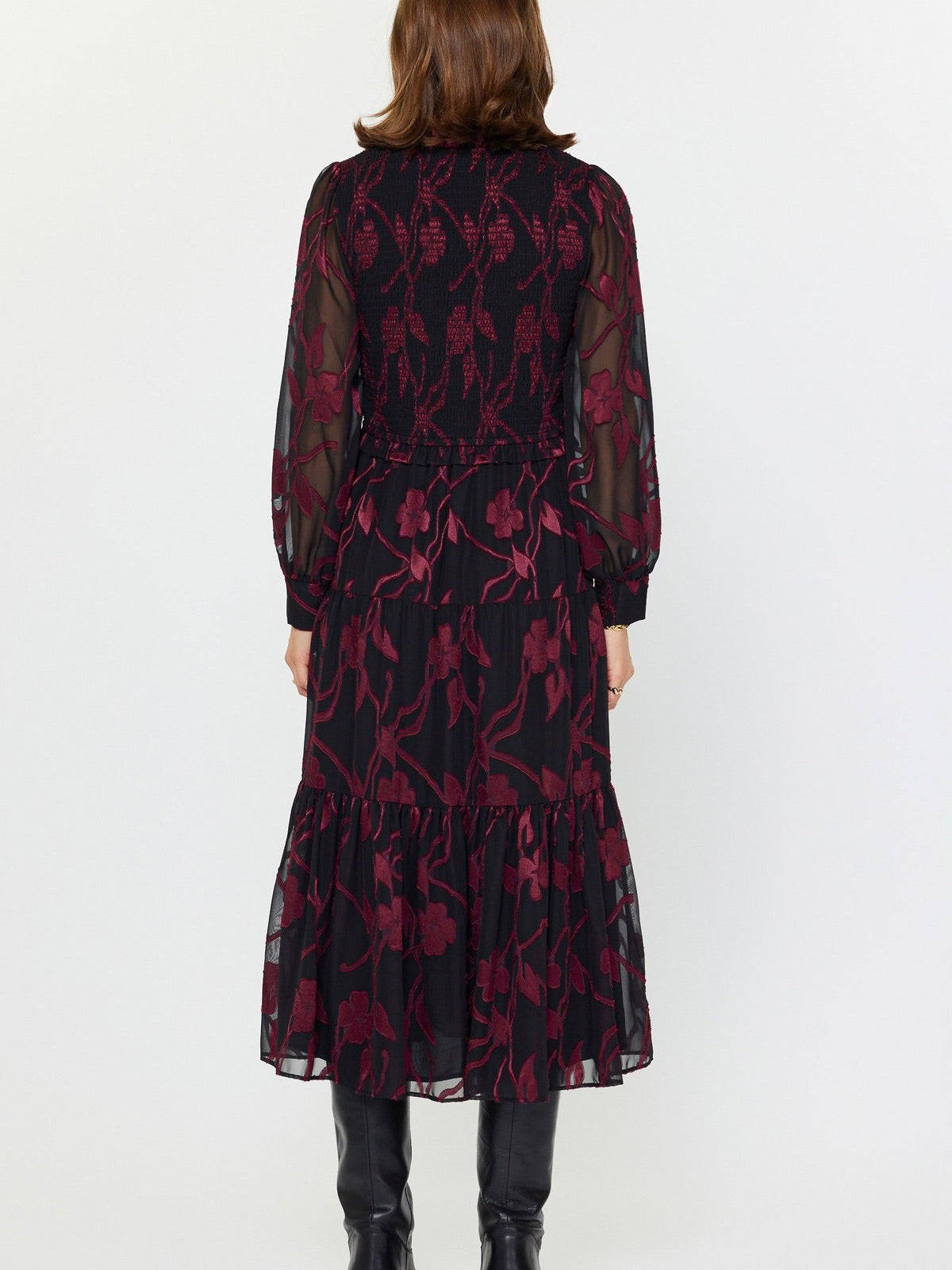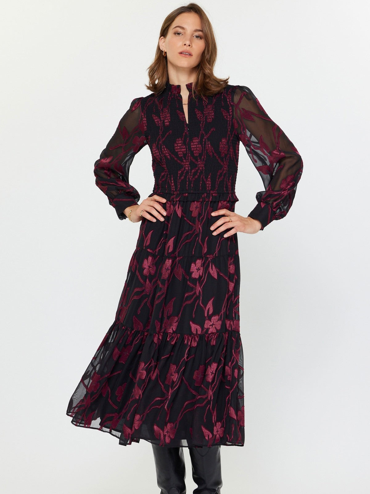 The Floral Jacquard Tiered Long Dress is effortlessly romantic with a touch of whimsy. Smocked details and a tiered midi skirt create a flattering, feminine silhouette, while sheer sleeves and a ruffled split neck add delicate, elegant charm. Perfect for garden parties, brunches, or any occasion that calls for a dreamy statement piece.