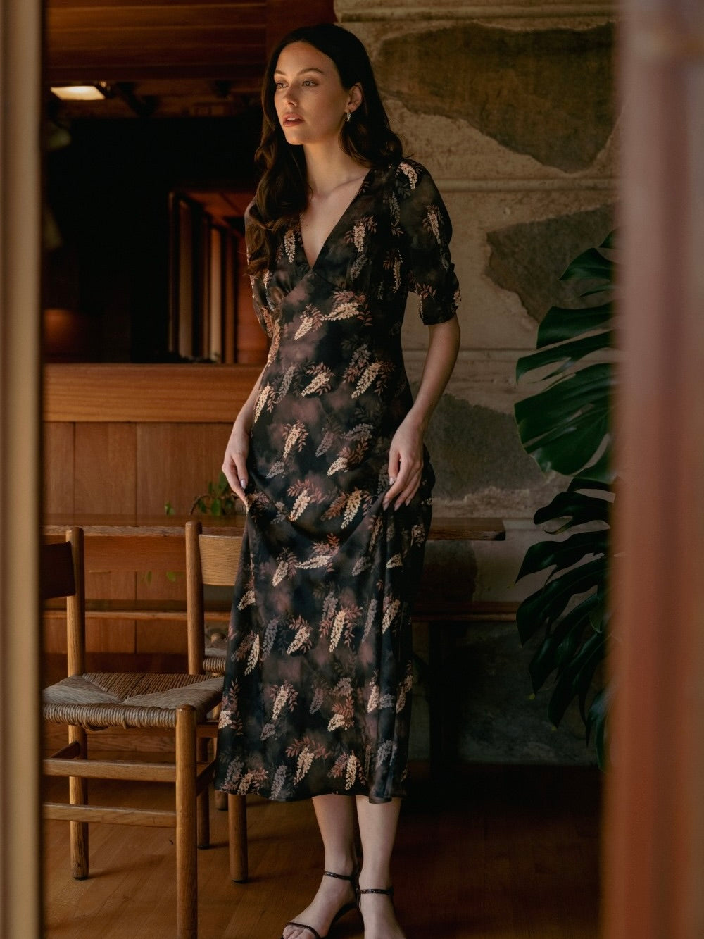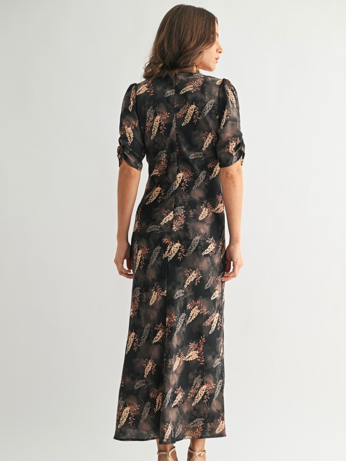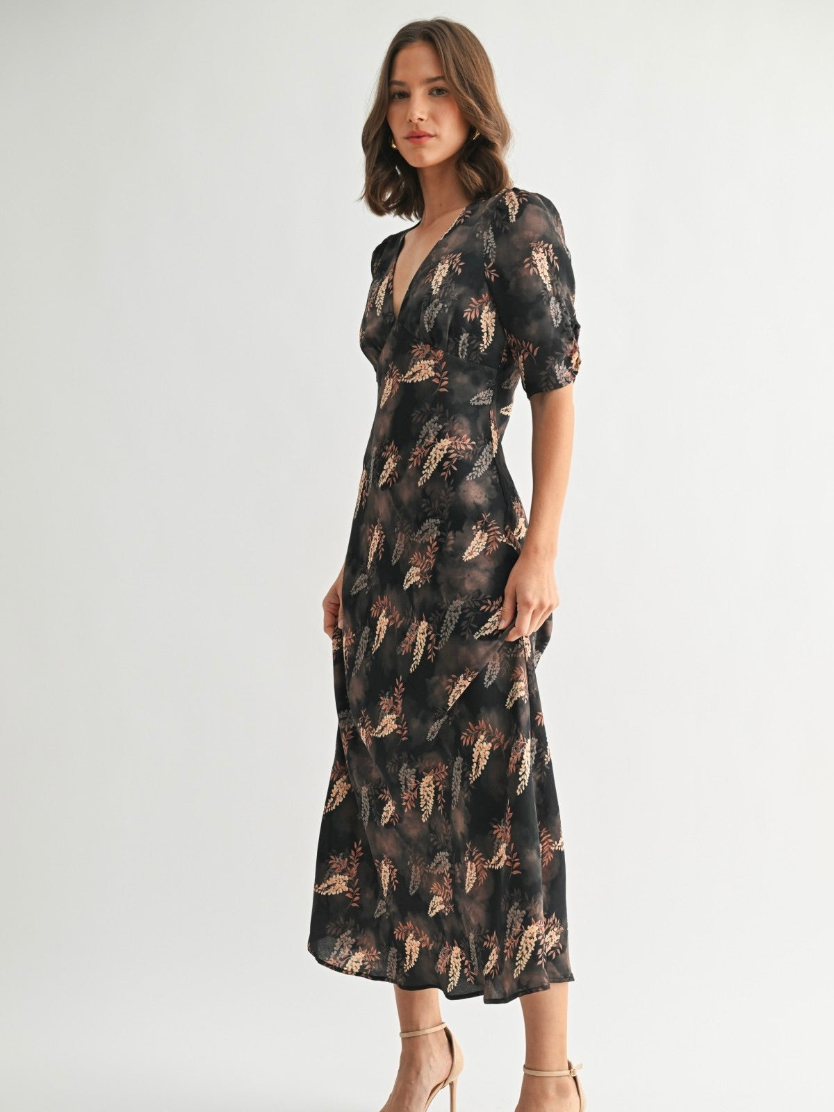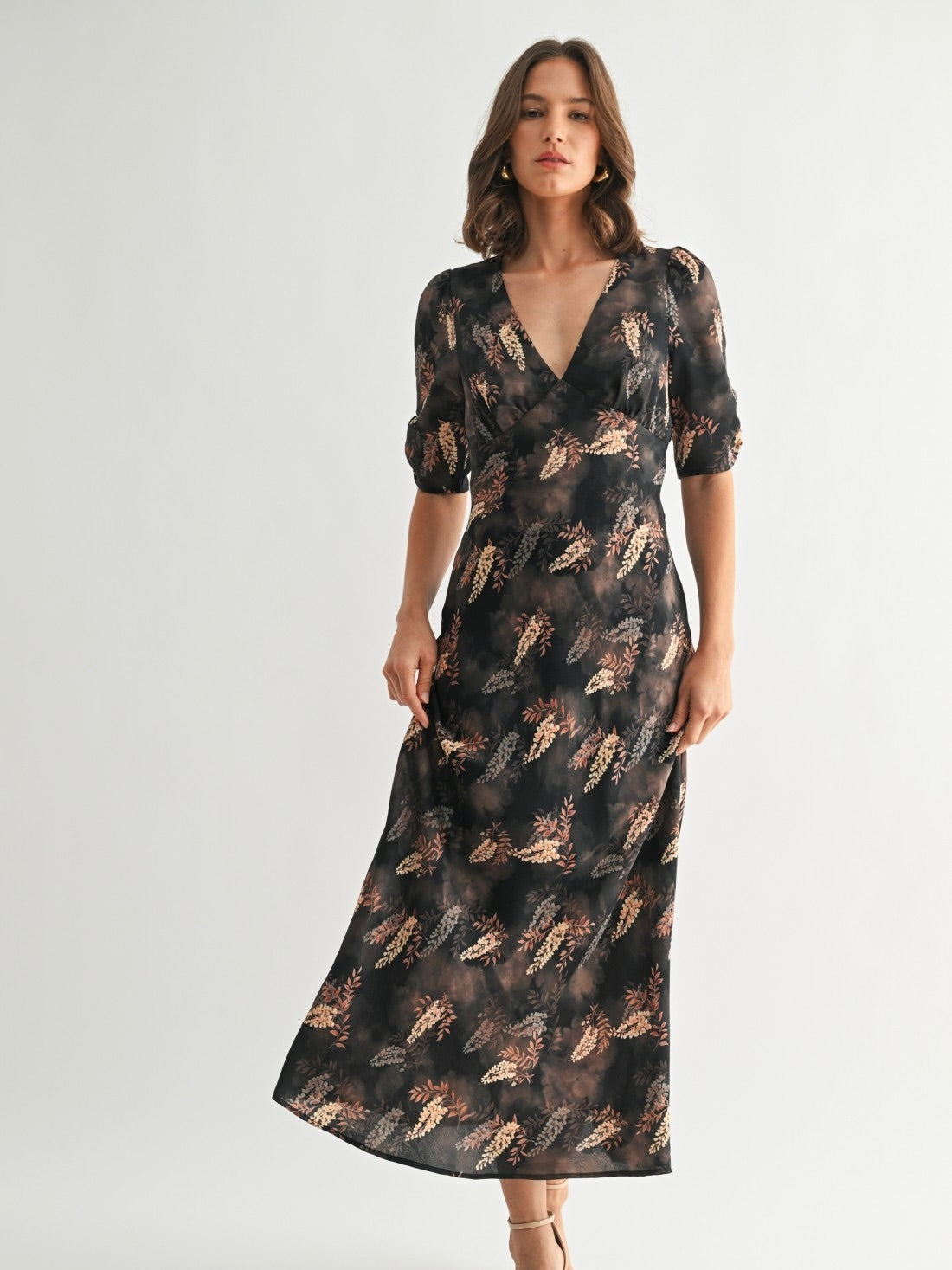 The Leaf Print Satin Dress is effortlessly chic with a flattering V-neckline and breezy sleeves. Its soft satin fabric and midi length give it a polished, flowy silhouette. Back zipper closure ensures a perfect fit, making it easy to slip on for any occasion. Pair with heels or flats for a look that’s graceful, playful, and ready to turn heads.