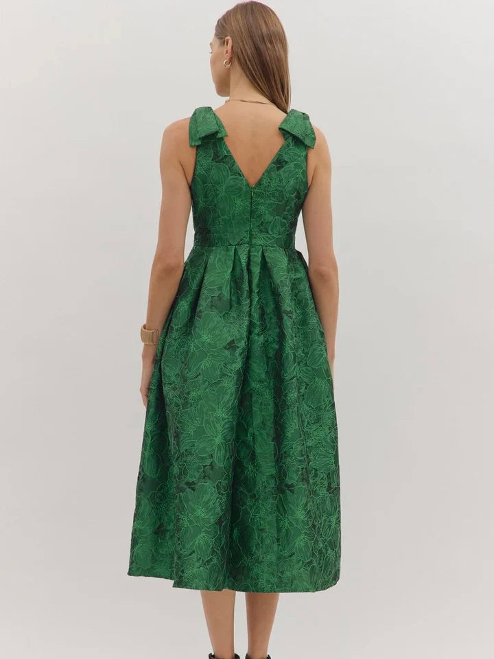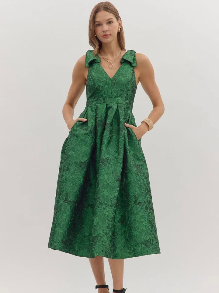 The Santana Dress is effortlessly elegant for special occasions. Bow-tied shoulders and a full midi skirt create flirty, polished movement, while side pockets add subtle practicality. Perfect for holiday gatherings, dinners, or any event where you want to shine.