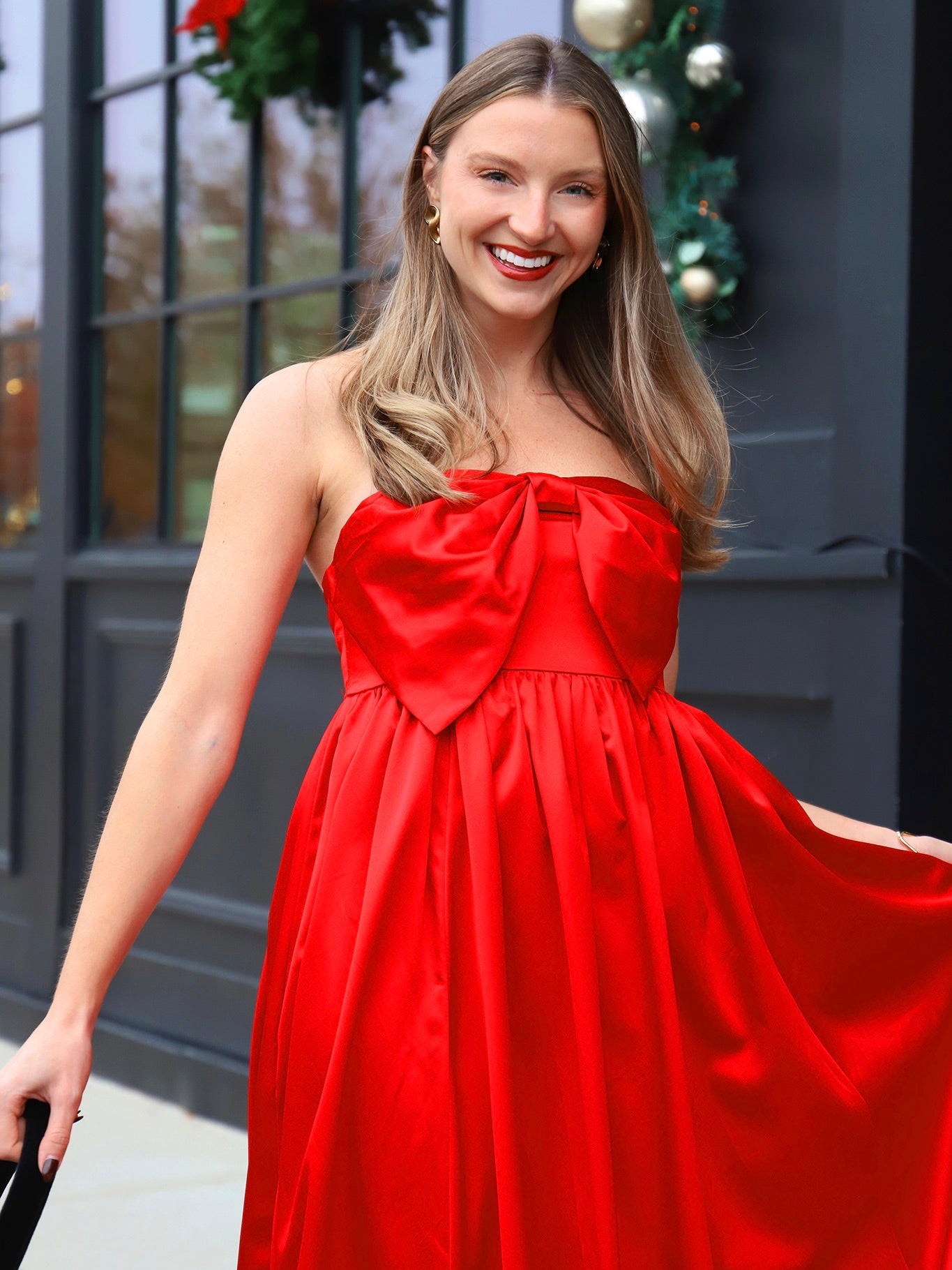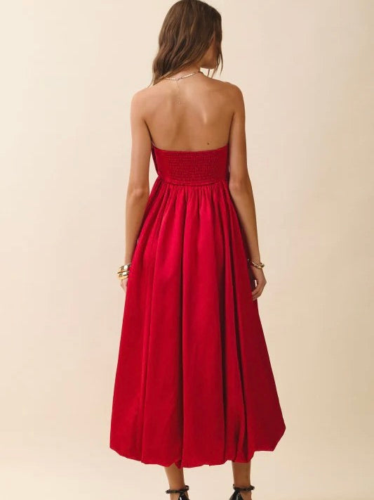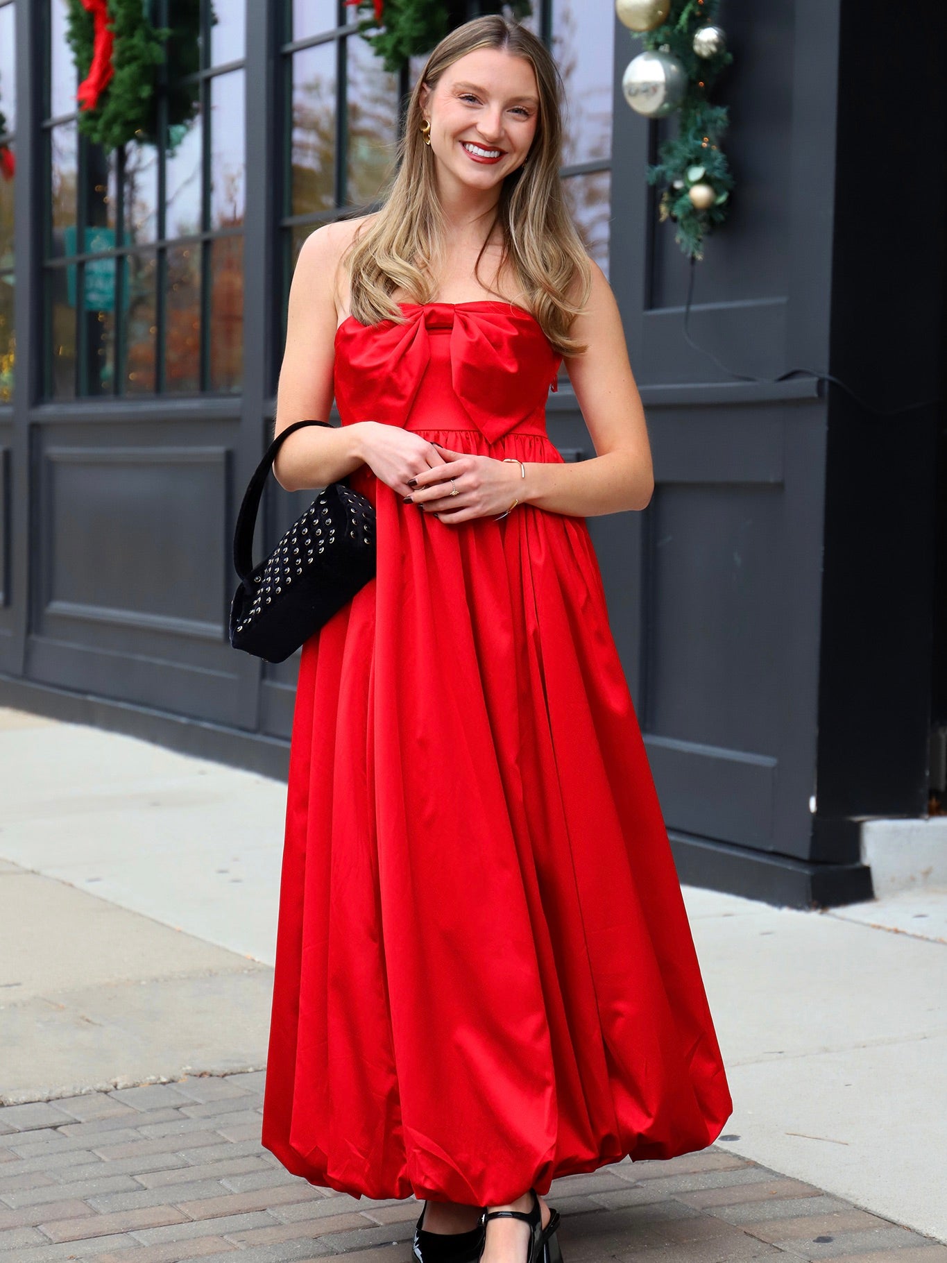Make a bold statement in the Strapless Bow Midi Dress, a stunning red dress that commands attention. The dramatic oversized bow adorning the front bodice adds instant glamour and sophistication to your look. Designed with a smocked back panel that moves with you for all-day comfort, this dress pairs elegance with wearability. The voluminous bubble hem skirt creates a playful, feminine silhouette that's perfect for special occasions or elevated everyday wear. Turn heads in this show-stopping piece that effortlessly blends drama with refined style.