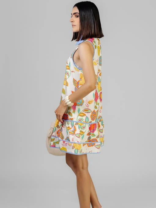 The Trudy Button Down Dress is a crisp, easy favorite with a playful twist. Featuring a collared neckline, sleeveless cut, and button-down front, it keeps things classic while contrast trim adds a pop of personality. The bright floral print brings a fresh, sunny feel that instantly lifts the whole look. The kind of dress that makes every day feel a little more fun.