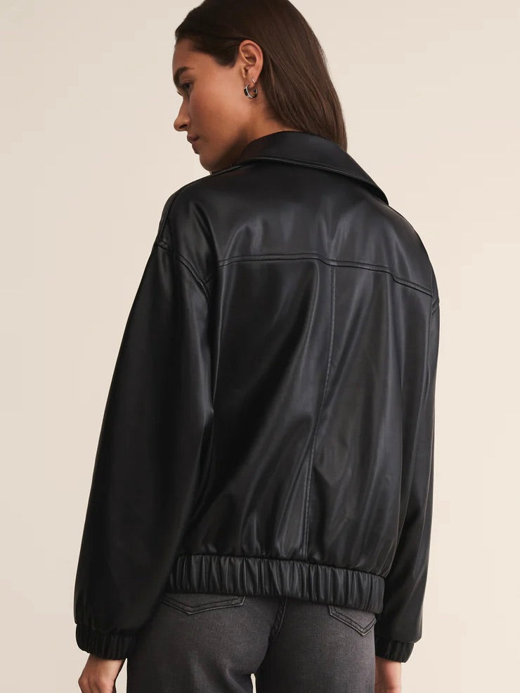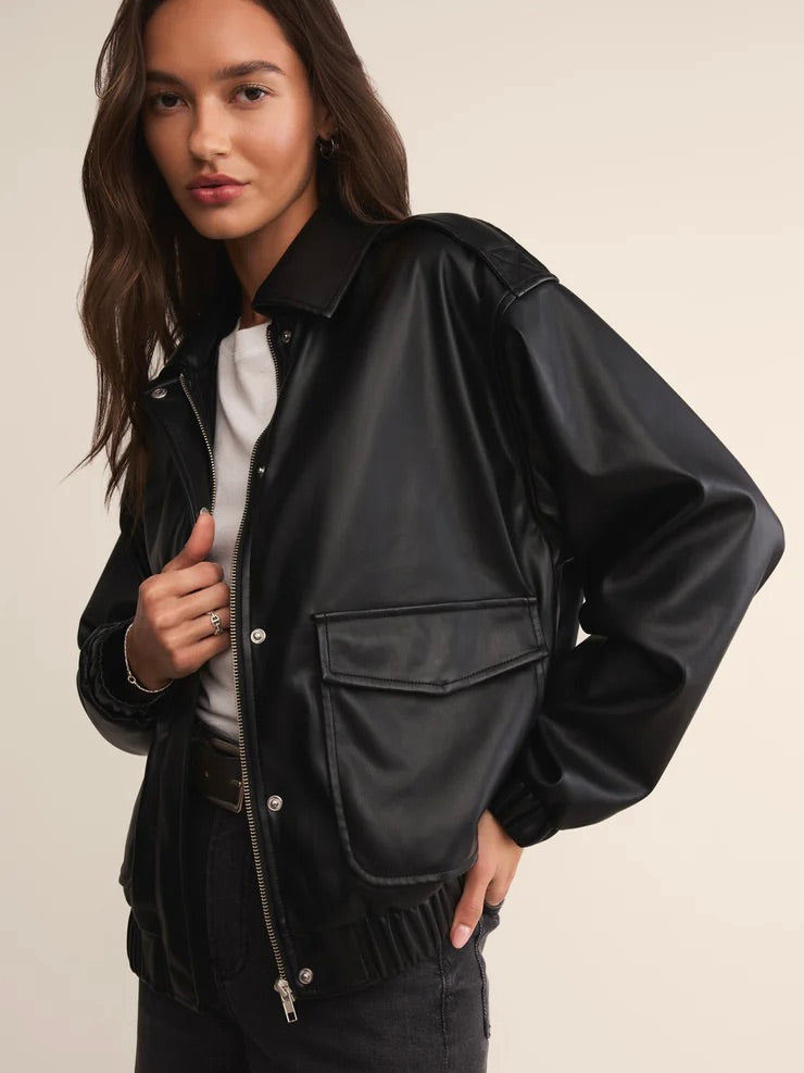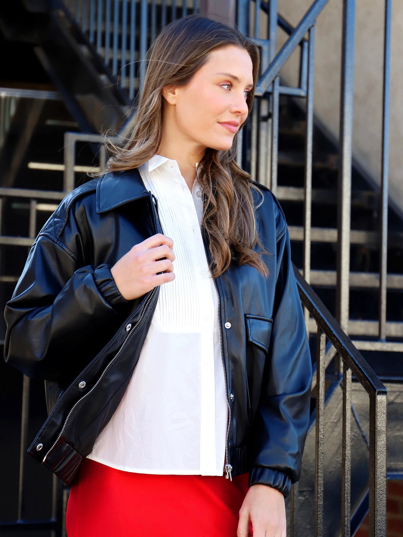 The Idols Bomber Jacket brings edgy, everyday style to your wardrobe. Made from smooth faux leather with a midweight feel, it features a collared silhouette, zip front, and flap pockets for functional flair. Effortlessly cool, it’s perfect for layering over everything from denim to dresses.