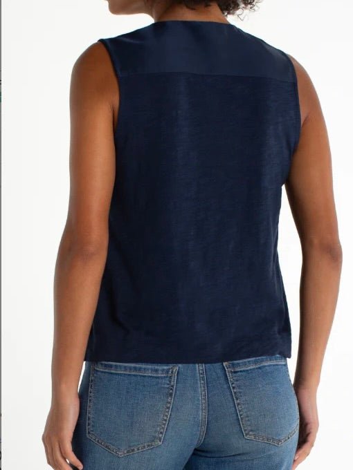 Where polish meets ease. This sleeveless top pairs a woven front for a clean, structured look with a soft knit back that moves with you. The result? A versatile piece that balances texture and comfort—effortlessly refined from day to night.