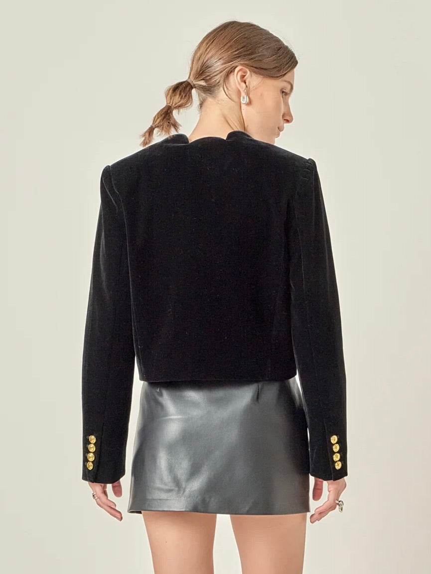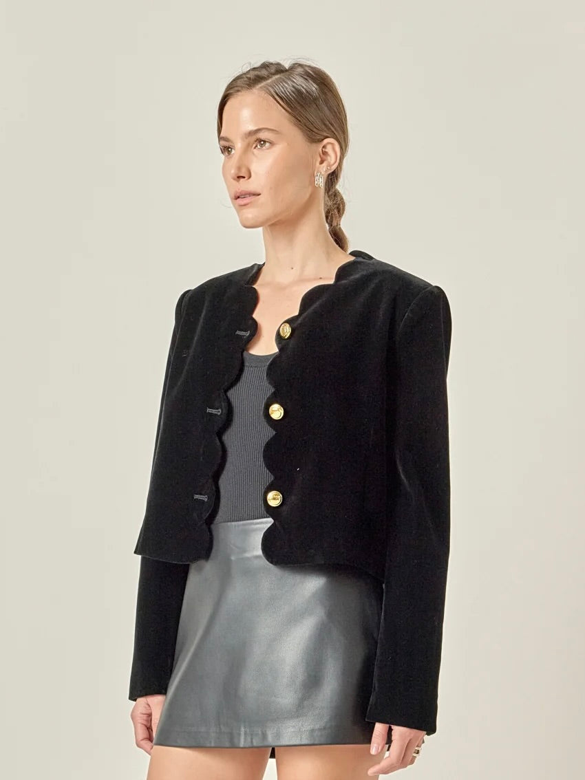 Step up your jacket game with our luxurious Velvet Scallop Jacket. Made with soft and smooth velvet this jacket is perfect for adding a touch of elegance to any outfit. The V-neckline and long sleeves give a sophisticated look while the buttoned cuffs add a stylish detail. Stay warm and stylish in this must-have jacket for any season. Perfect for both casual and formal occasions this versatile jacket is a must-have in every fashionista's wardrobe.