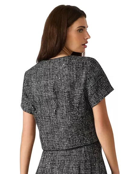 Shimmering sequin tweed brings rich texture to this Steve Madden top, cut in a compact silhouette with short sleeves and a clean crewneck. A front button closure, finished with polished crest buttons, completes the look with refined detail.