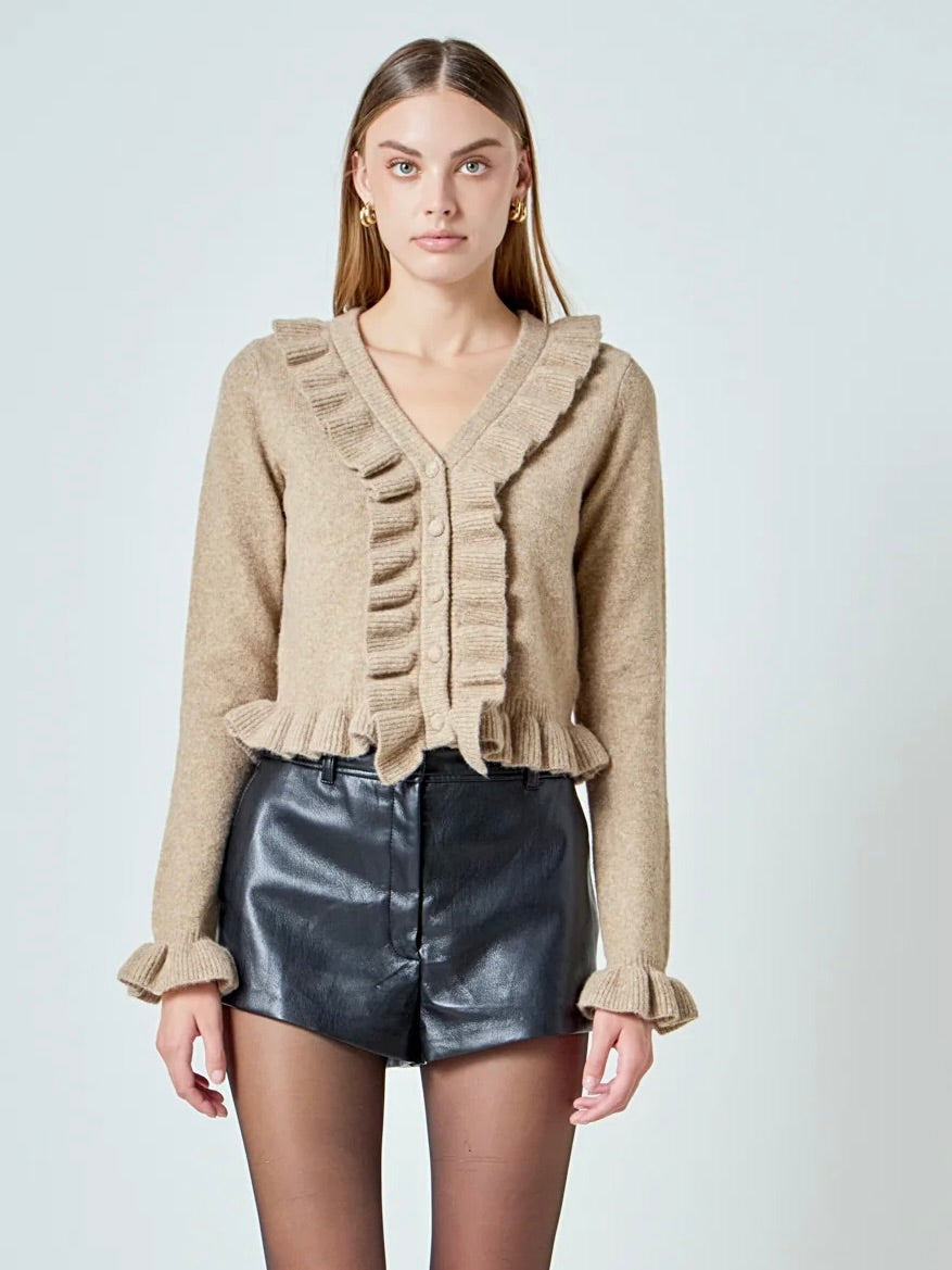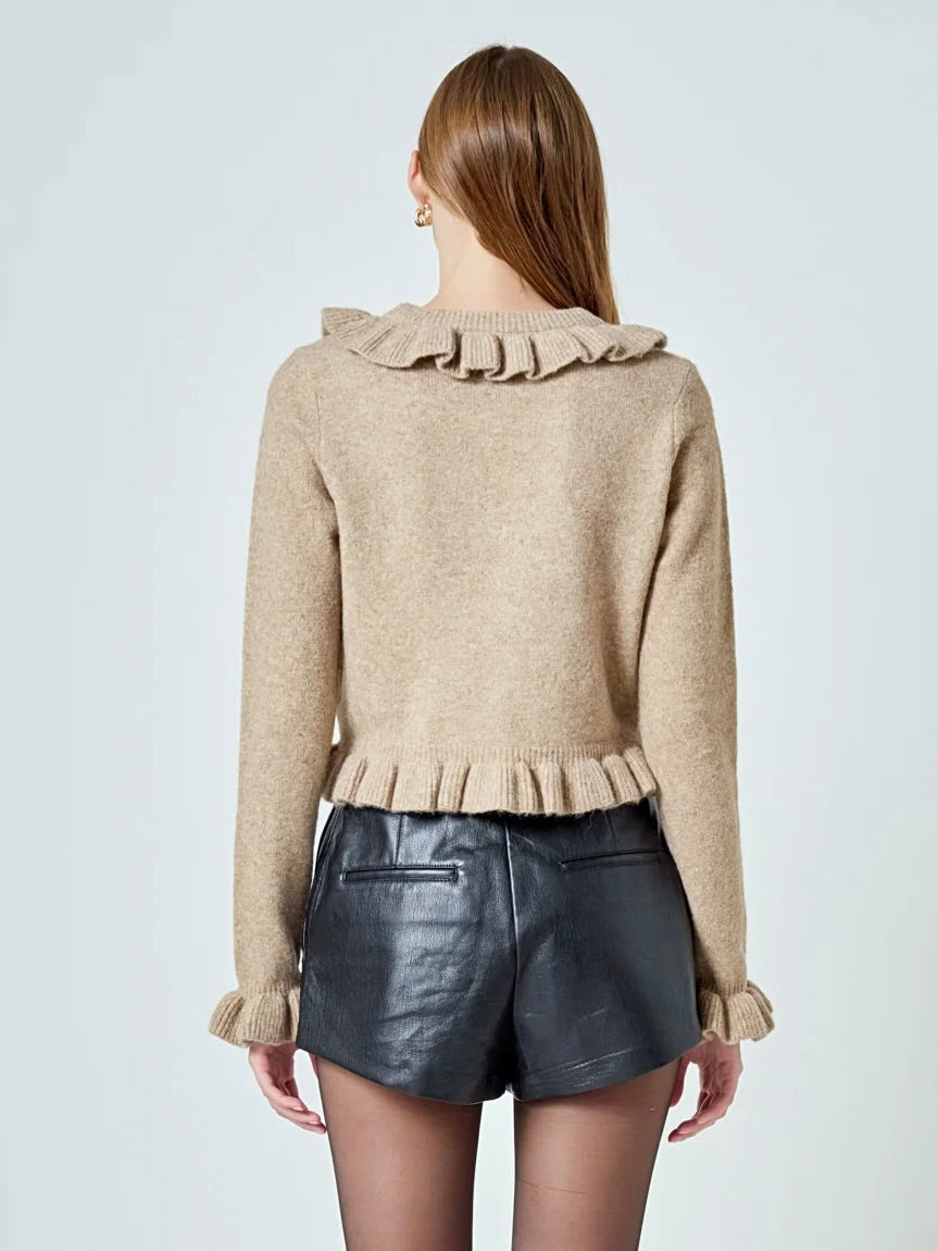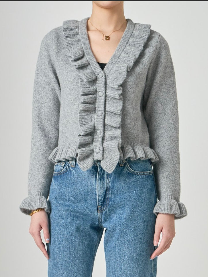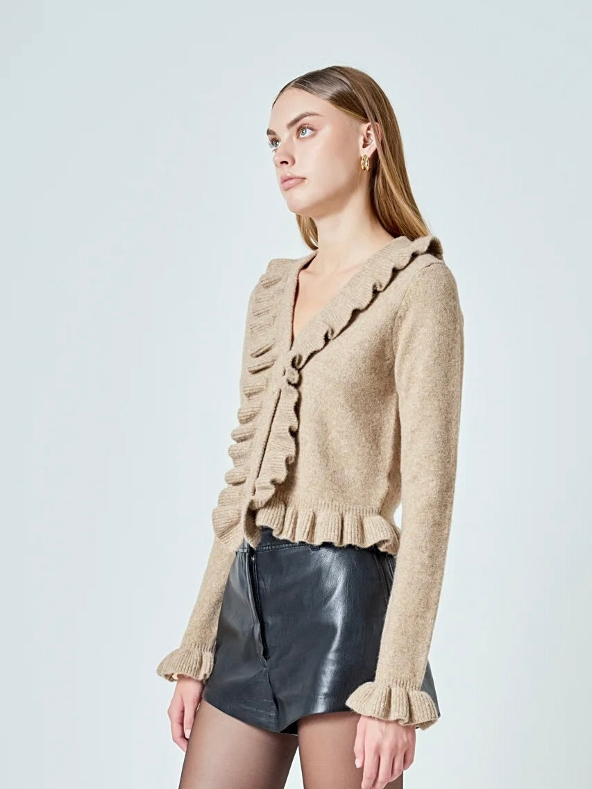 Add a romantic twist to your knitwear collection with our Adeline Cardigan. Designed with a delicate ruffled neckline and a flattering V-cut, this piece brings effortless femininity to your everyday style. Crafted from a soft, cozy knit, it offers the perfect balance of comfort and elegance, making it a go-to for cooler days. Its versatile silhouette allows you to layer it over casual denim or pair it with skirts and trousers for a more polished look. Finished with playful ruffle details that elevate a classic cardigan, this is a wardrobe essential you'll reach for all season long.
