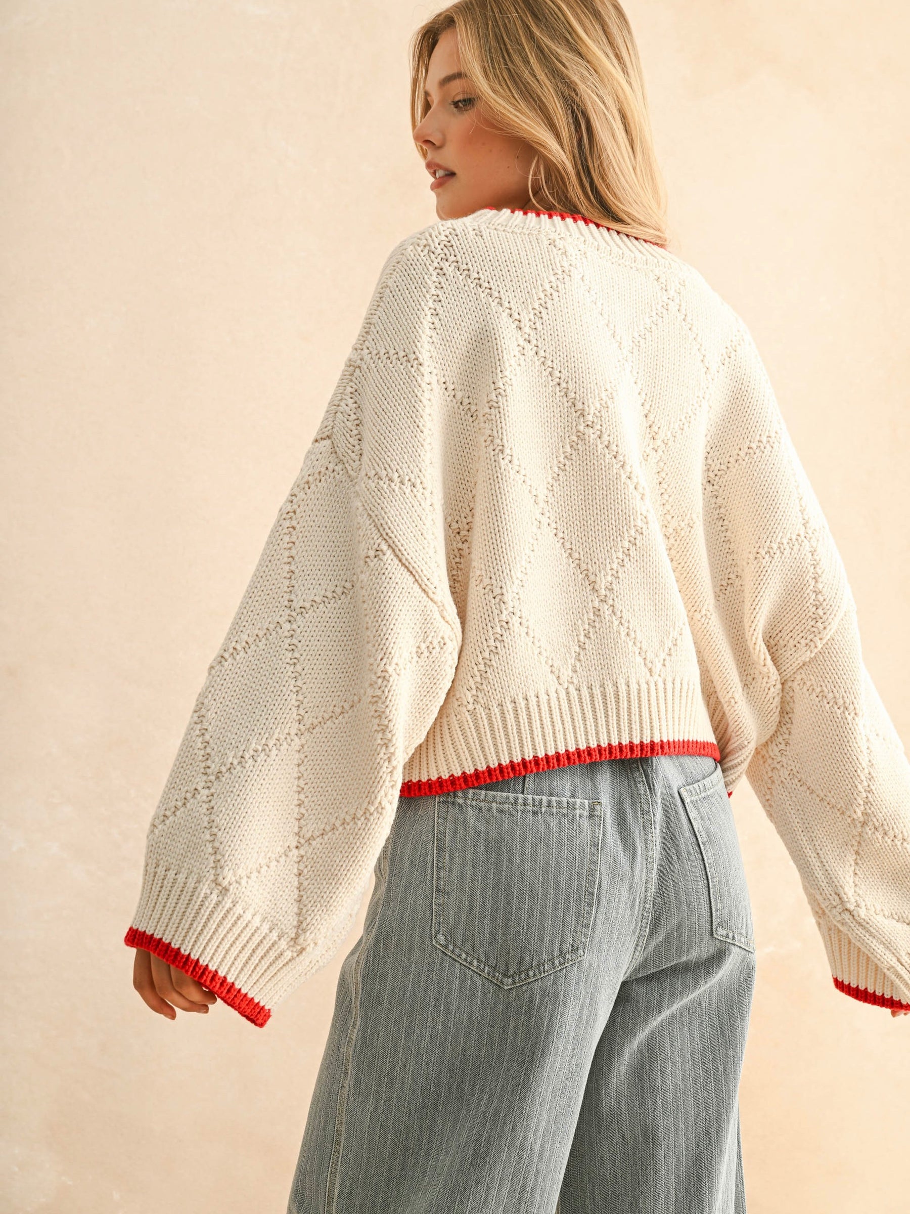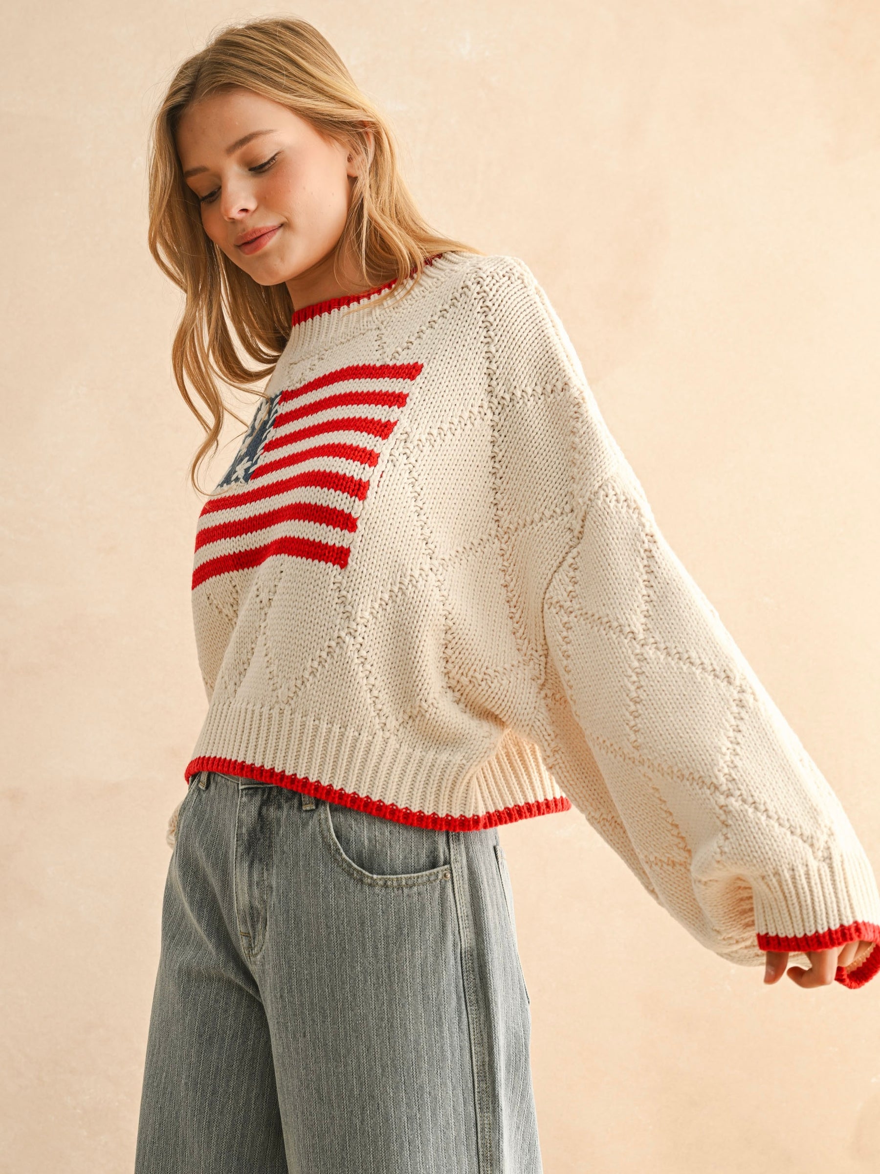 The American Spirit Sweater brings cozy comfort with a bold, all-American twist. Featuring a classic round neckline and contrast trim, it’s finished with a striking American flag graphic layered over a diamond pattern for extra visual interest. The cropped fit makes it easy to style with high-rise denim or skirts for an effortlessly cool, everyday look.