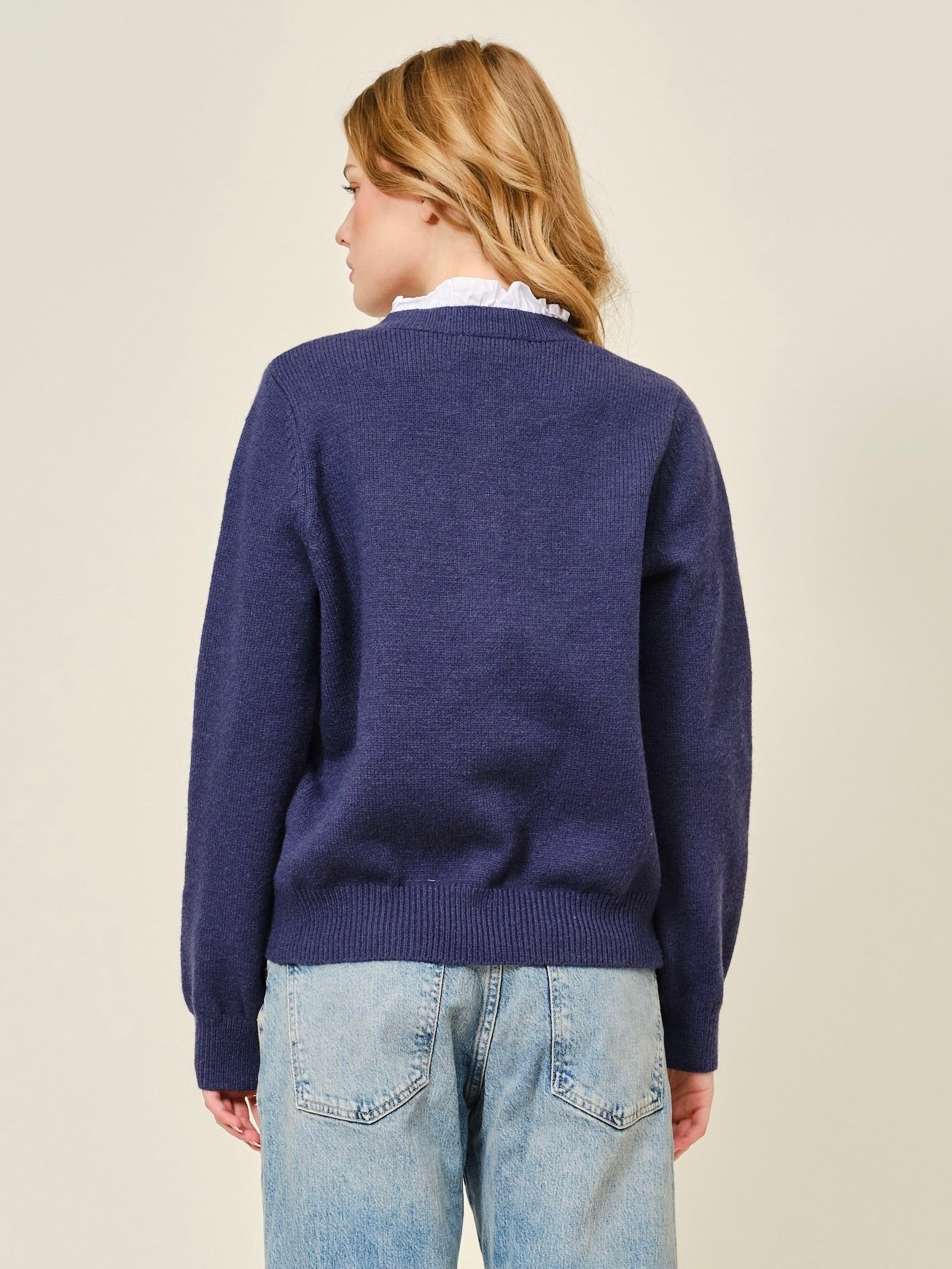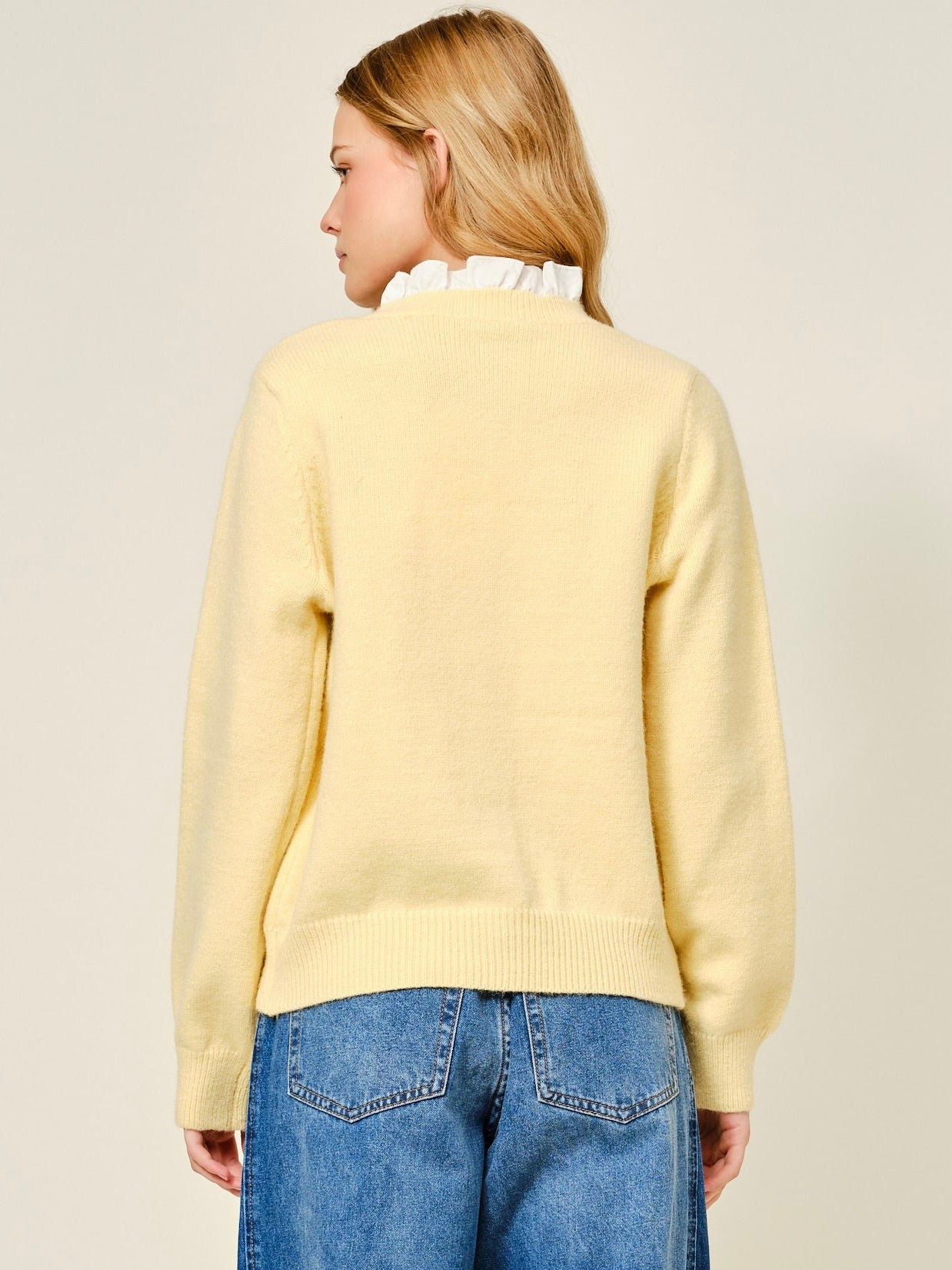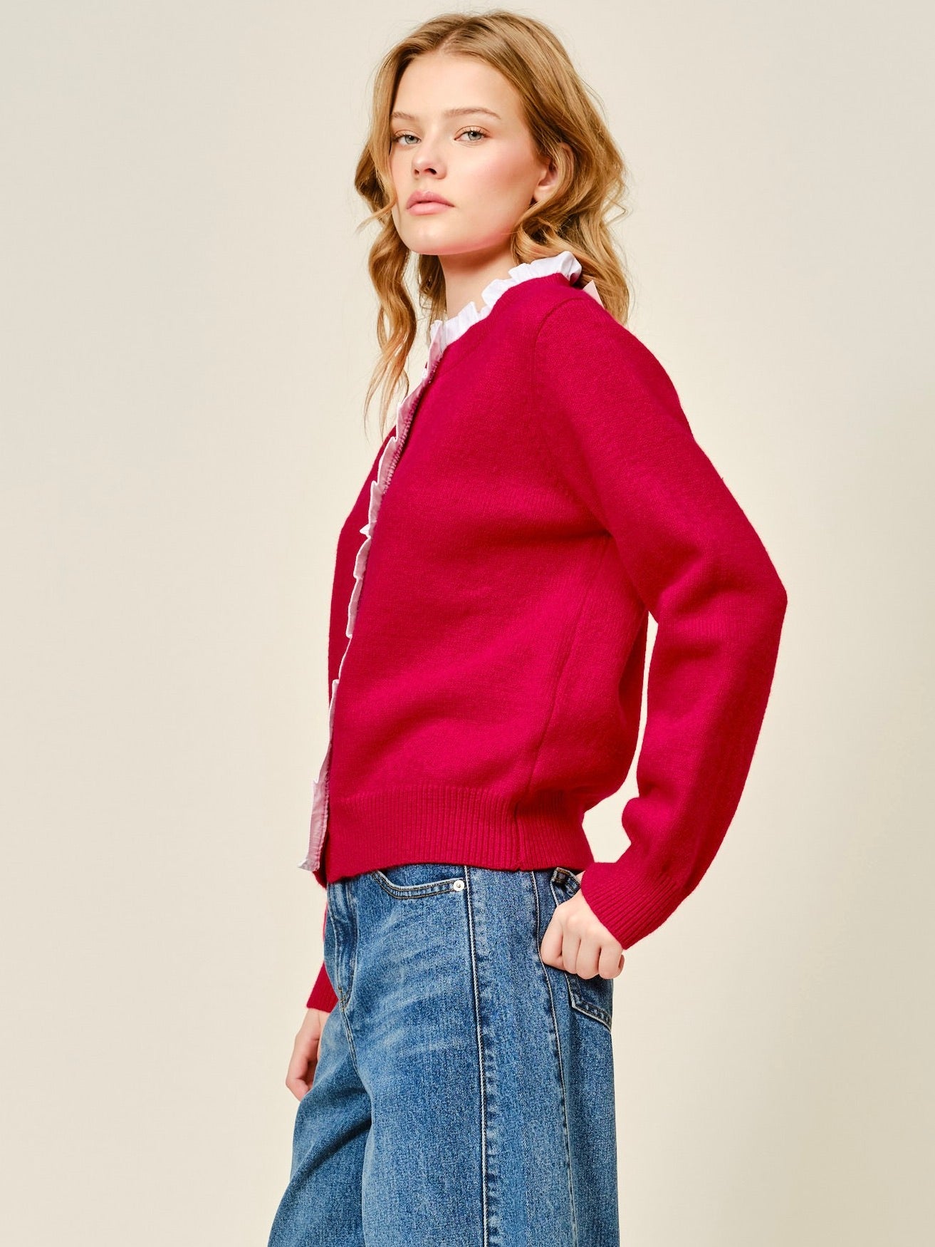The Janelle Cardigan brings a sweet, polished touch to your everyday layers. Designed with a classic round neckline and button-down front, it’s finished with contrast ruffle trim for a subtle pop of charm. The classic fit makes it easy to style—perfect with denim for a casual day or dressed up with tailored pants for a more put-together look.
