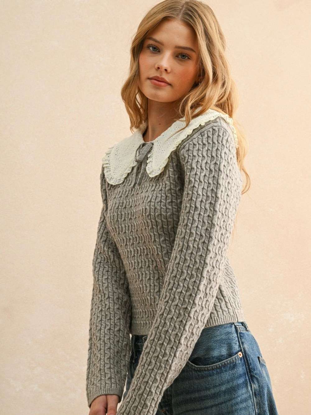 The Alanis Sweater blends classic knit texture with sweet details you’ll love. Designed with a Peter Pan collar, cable knit pattern, and delicate crochet trim, it feels special without being overdone. Long sleeves, a front tie detail, and a back keyhole button closure finish the look, making it an easy favorite for dressing up your everyday rotation.