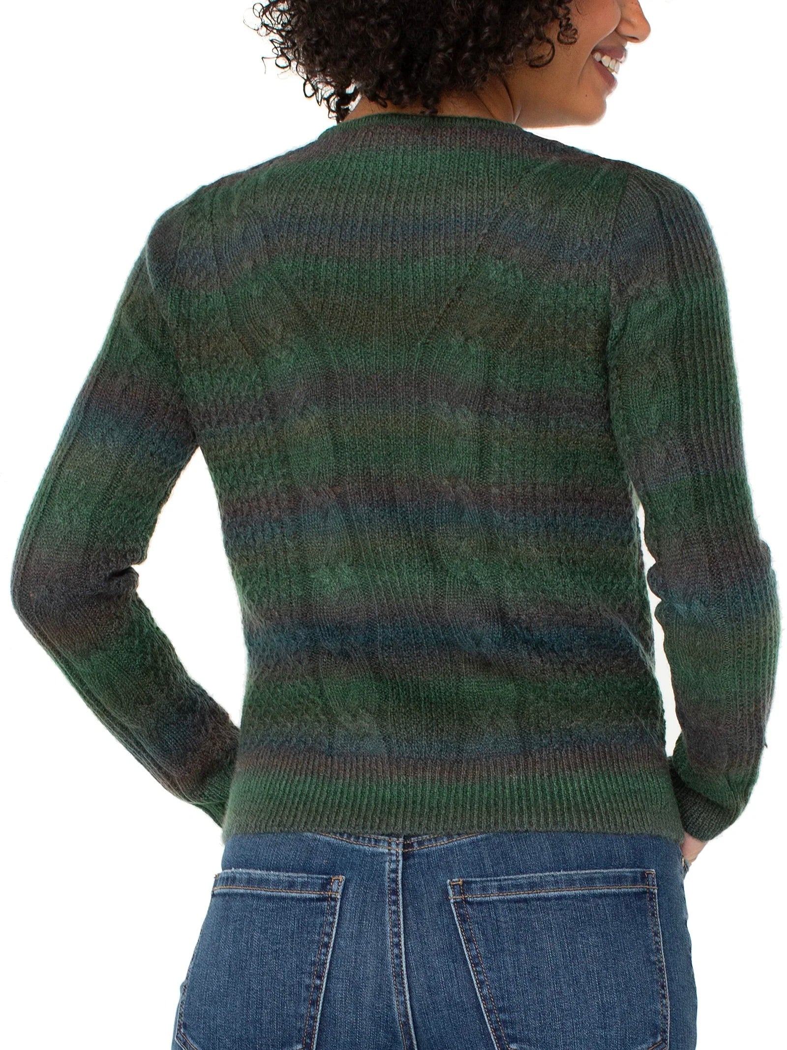 A modern knit with rich texture and dimension. This sweater in emerald spacedye is crafted with soft yarns and detailed cable stitching that create visual depth. Effortlessly easy to wear, the vibrant spacedye brings a fresh pop of color to your fall lineup.