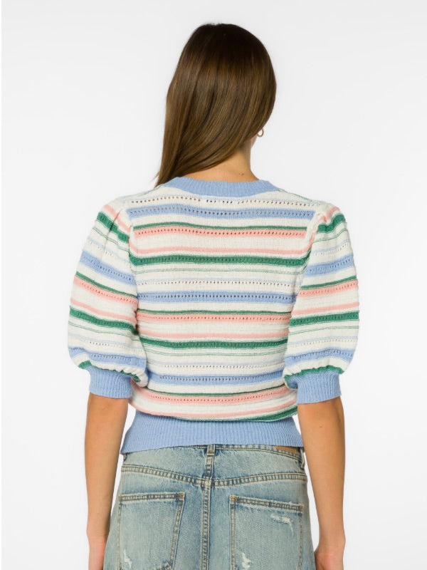 The Mable Stripe Sweater is a playful, polished take on a classic knit. Featuring a flattering V neckline, 1/2 puff sleeves, and contrast trim, it adds just the right amount of detail. The cropped fit makes it perfect for pairing with high-rise jeans or skirts for an effortlessly chic look.