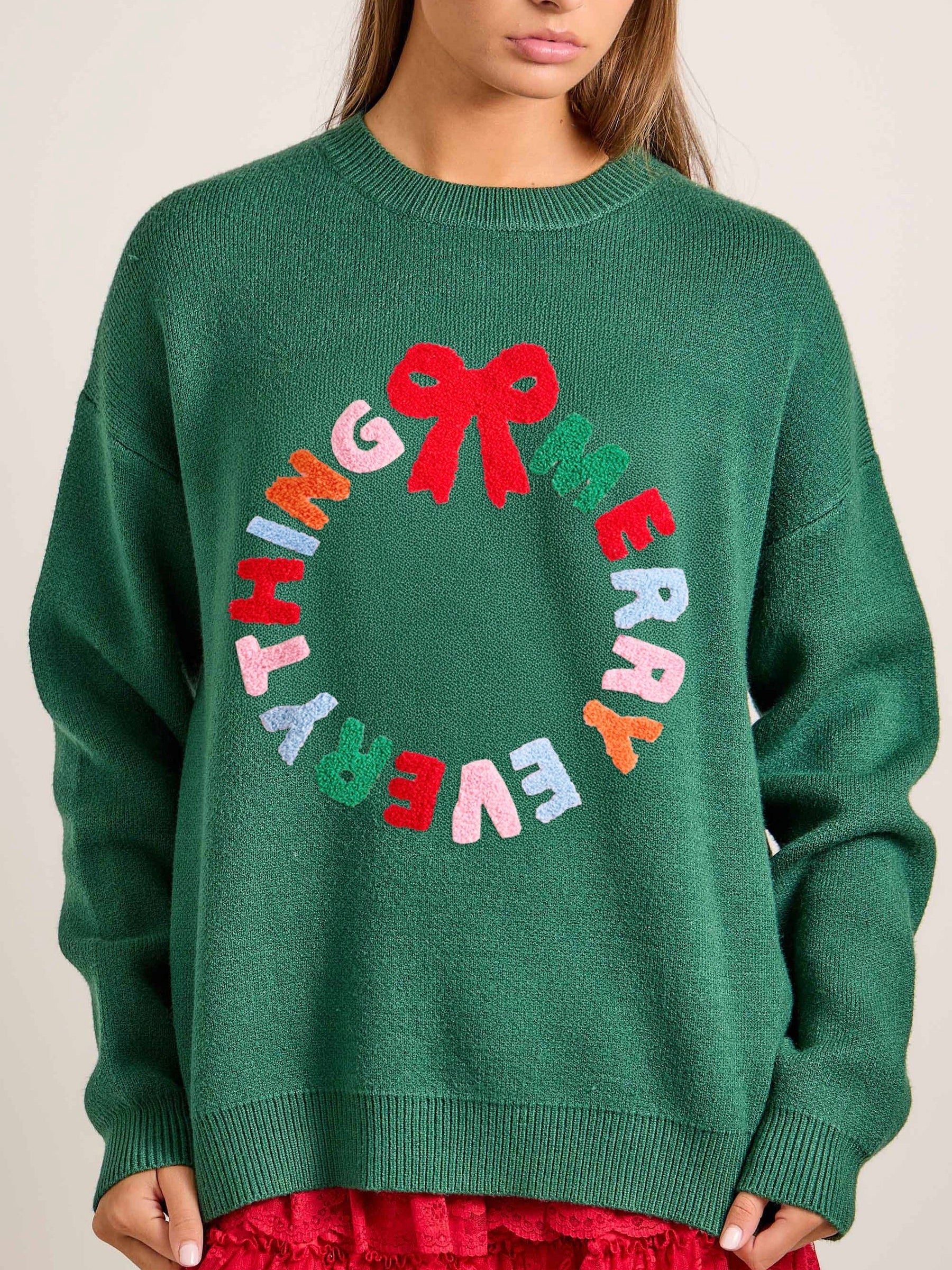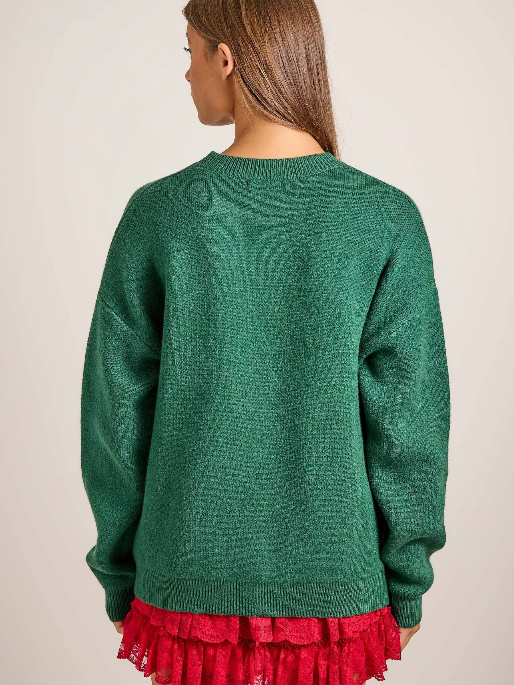 Wrap yourself in cozy charm with this hunter green sweater that's as soft as it is adorable. The delicate stitching details add a touch of whimsy, making it perfect for festive gatherings or casual days at home. You'll love how this piece feels against your skin while turning heads with its playful design. A wardrobe essential that brings both comfort and personality to your seasonal style.