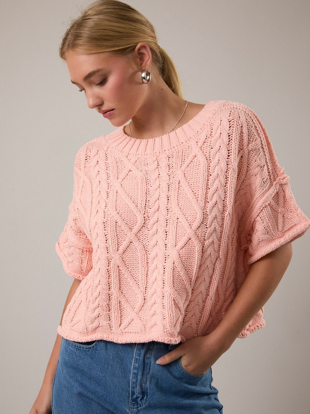The Katie Short Sleeve Sweater is a fresh take on a classic knit. Designed with a round neckline and textured cable knit detail, this short-sleeve style is perfect for easy layering or wearing on its own. The soft cotton-blend fabric keeps it comfortable while giving your everyday look a polished, effortless feel.