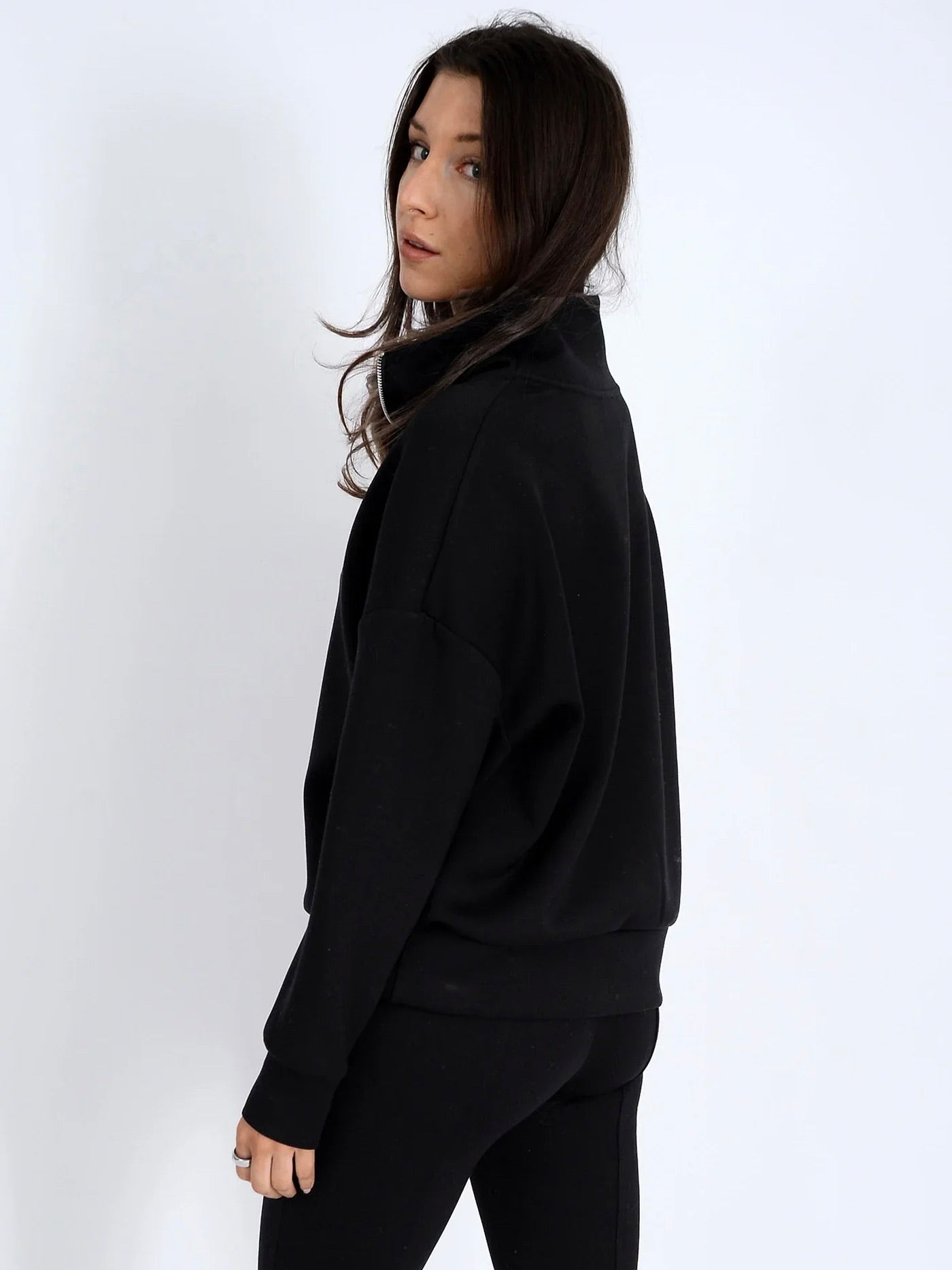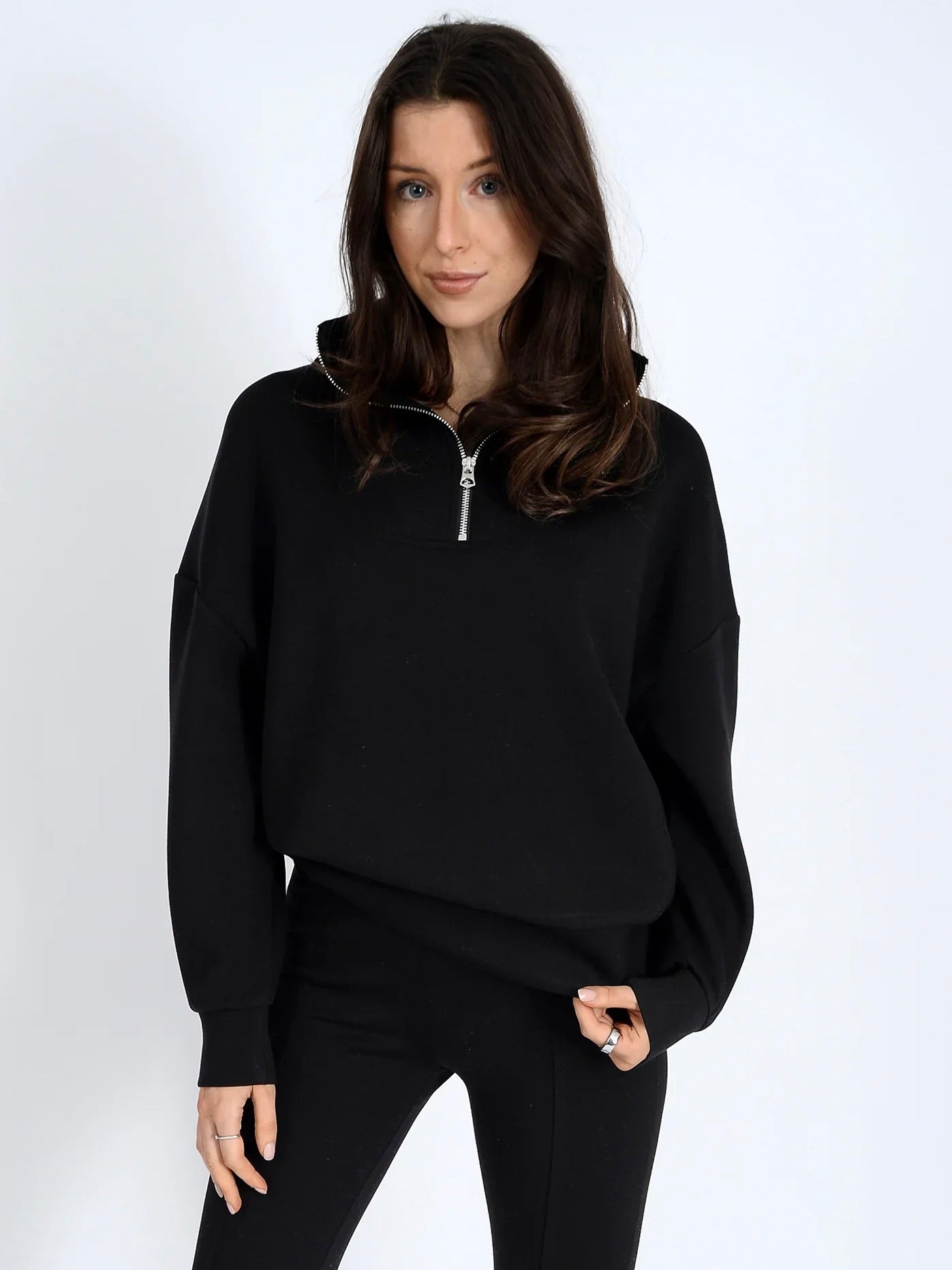 The Seanni Soft Knit Half Zip Pullover is the perfect blend of casual comfort and modern style. Designed in a classic black knit, this mid-length pullover features a half-zip neckline, relaxed drop shoulders, and a cozy yet polished fit. Effortless to throw on and easy to style, it’s the kind of piece you’ll keep reaching for season after season.